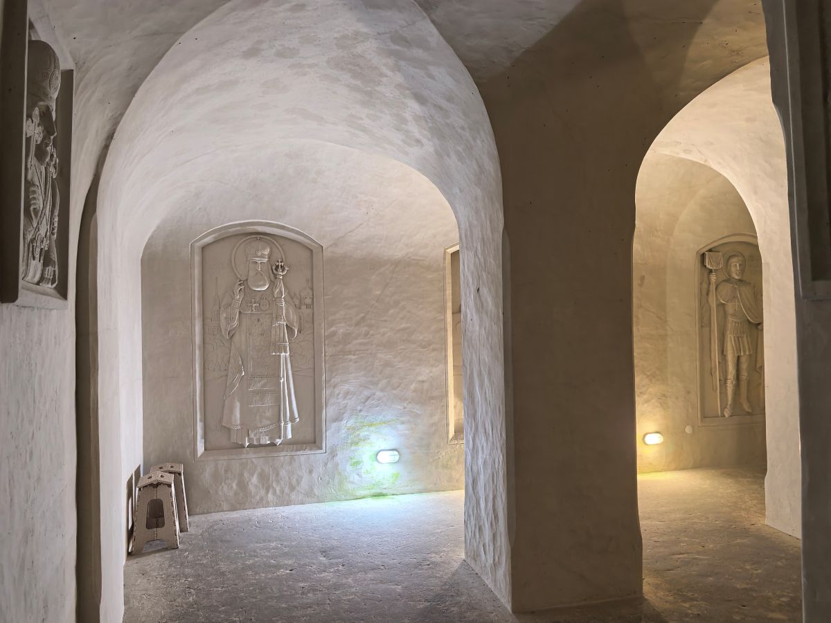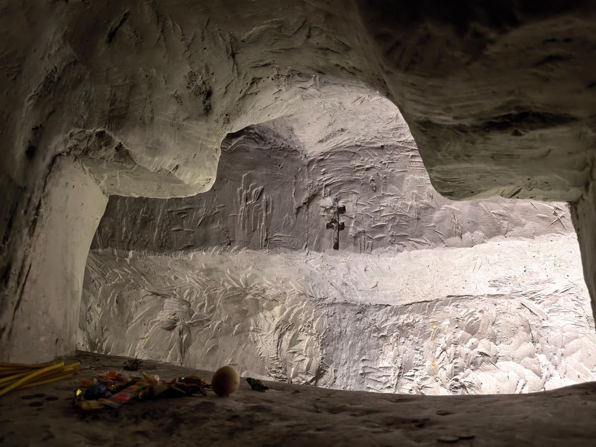 Отшельники углублялись в холм, откалывая мел и вынося его наружу. Мел внутри скалы мягкий, как пластилин, поэтому внутри пещерного храма вырезаны лики святых. С веками мел затвердел и стал как камень. В этом белоснежном пространстве внутри земли каждое сказанное слово молитвы усиливается и становится слышно для Бога.