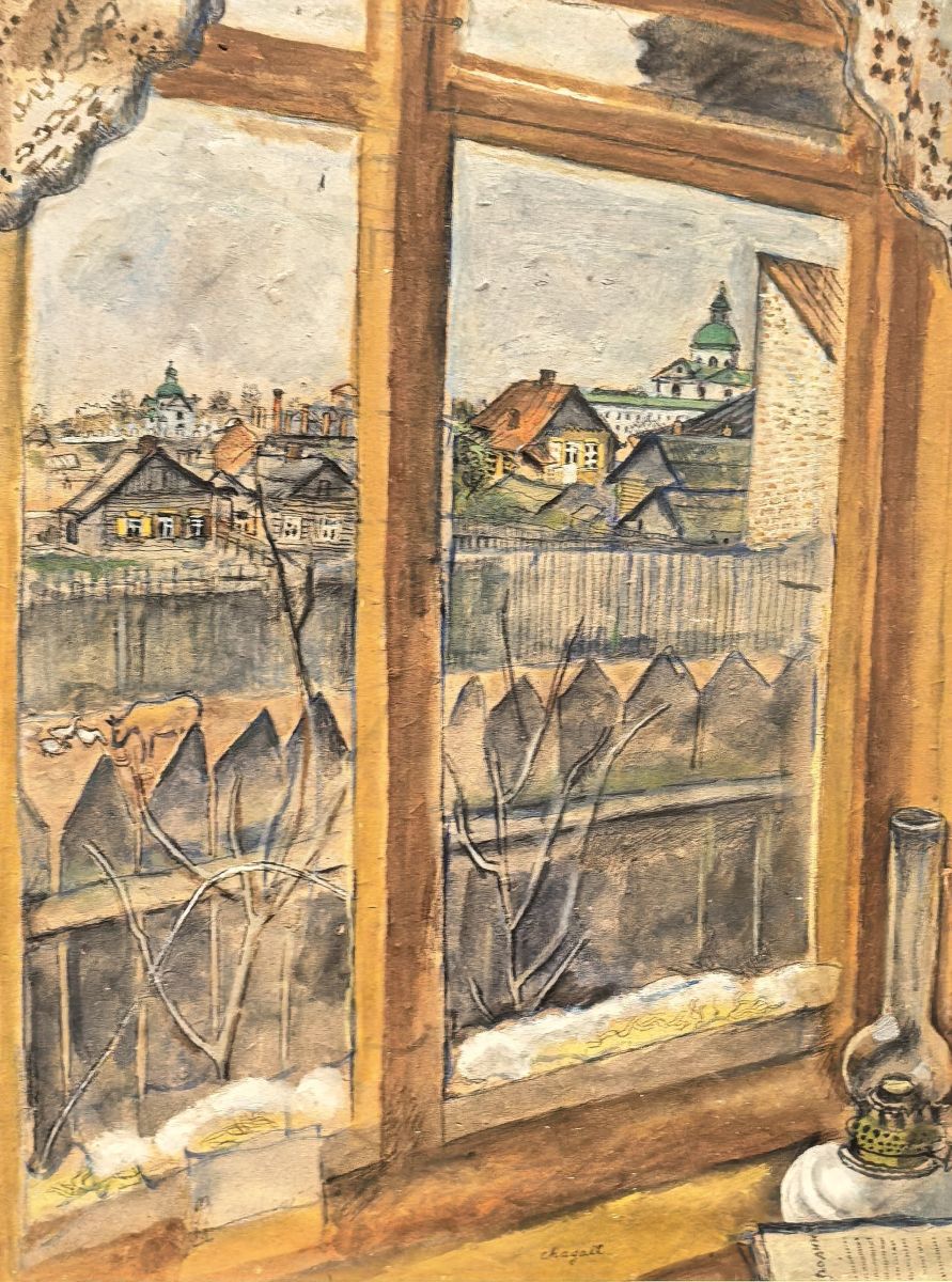 Город Витебск как гармонь складывался и раскладывался на его полотнах, нарушая все законы архитектуры и композиции. Он любил Витебск, а еще он любил Париж. Поэтому соединил их в своей фантазии — покосившиеся дома родного города соседствовали на его полотнах с улочками Парижа. В его реальности Витебск и Париж были совсем рядом, достаточно было выглянуть в окно, а потом «взлететь» и оказаться во Франции.