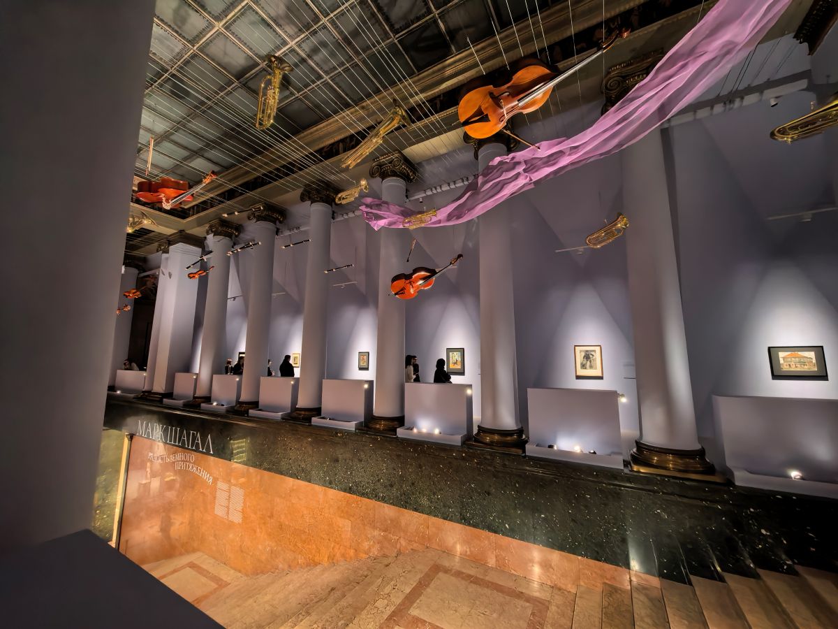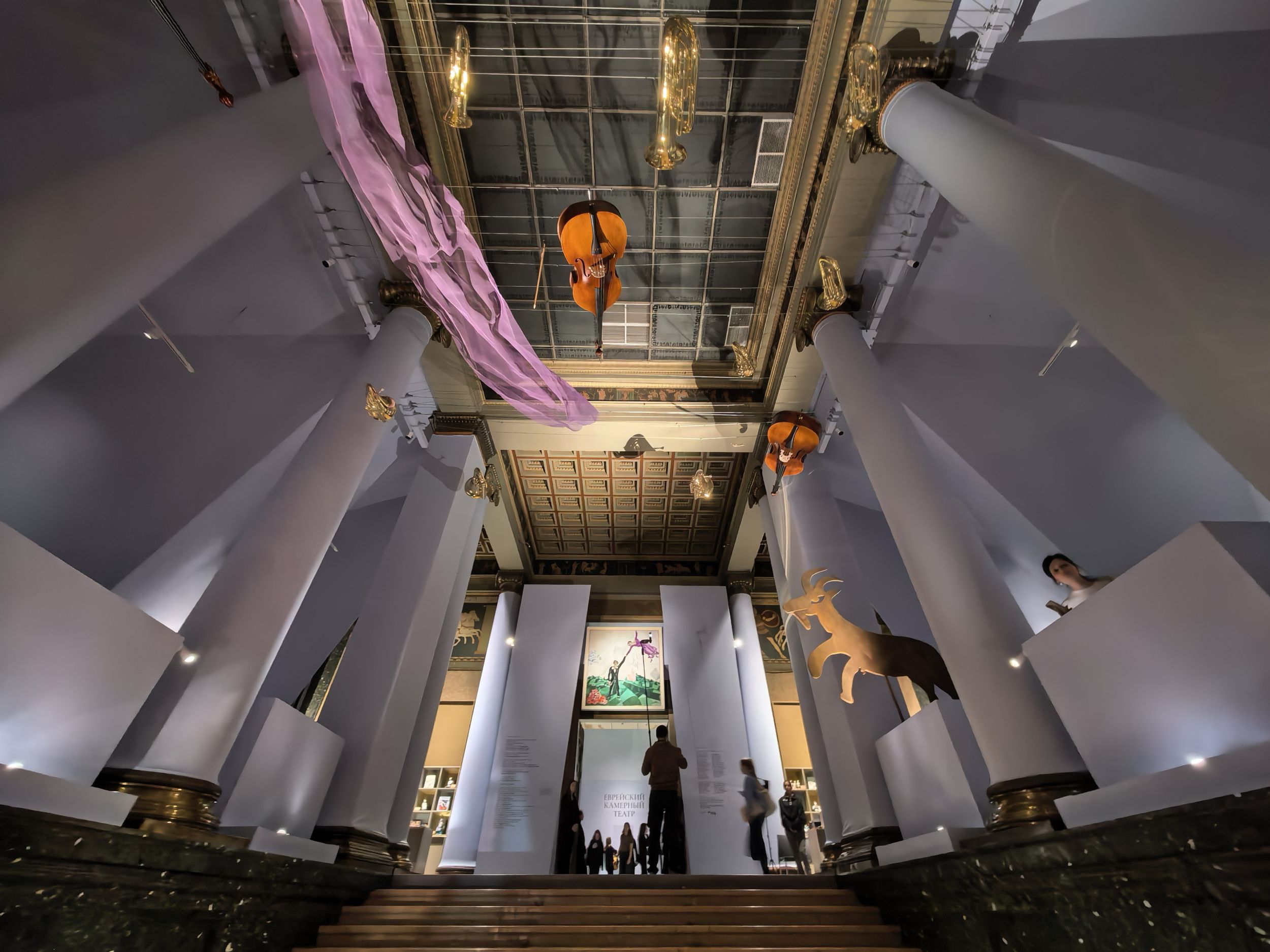 Центром экспозиции в Белом зале музея стала реконструкция зрительного зала Еврейского камерного театра, для которого художник в 1920 году расписал девять панно.