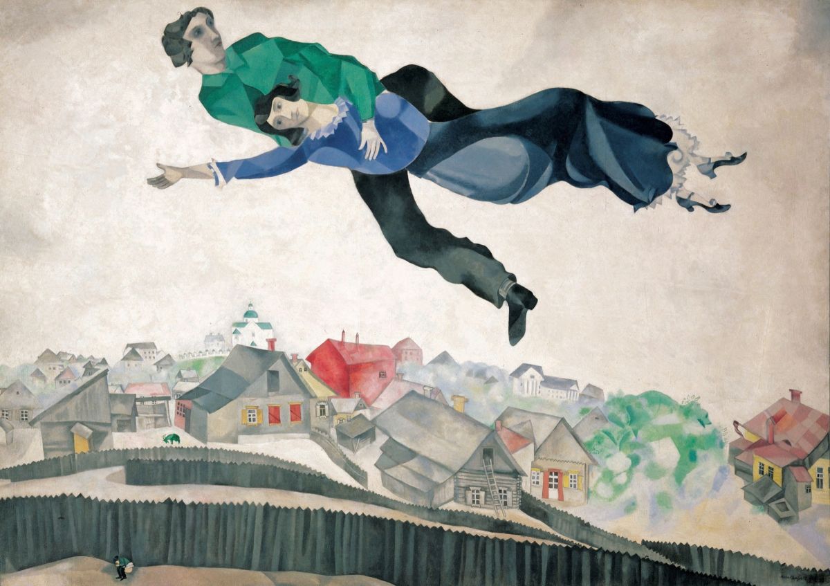Его первой женой стала необыкновенная красавица Белла Розенфельд. Рядом с ней Шагал чувствовал себя в невесомости, да и сама Белла, казалось, не ходила по земле, как все обычные люди, а парила над ней. Своей любовью Марк вознёс её на небеса. Их полёты во сне и наяву художник запечатлеет на многих своих полотнах. Вместе с ними в небо взлетали и другие люди, козы, коровы, лошади, часы, скрипки и рыбы.