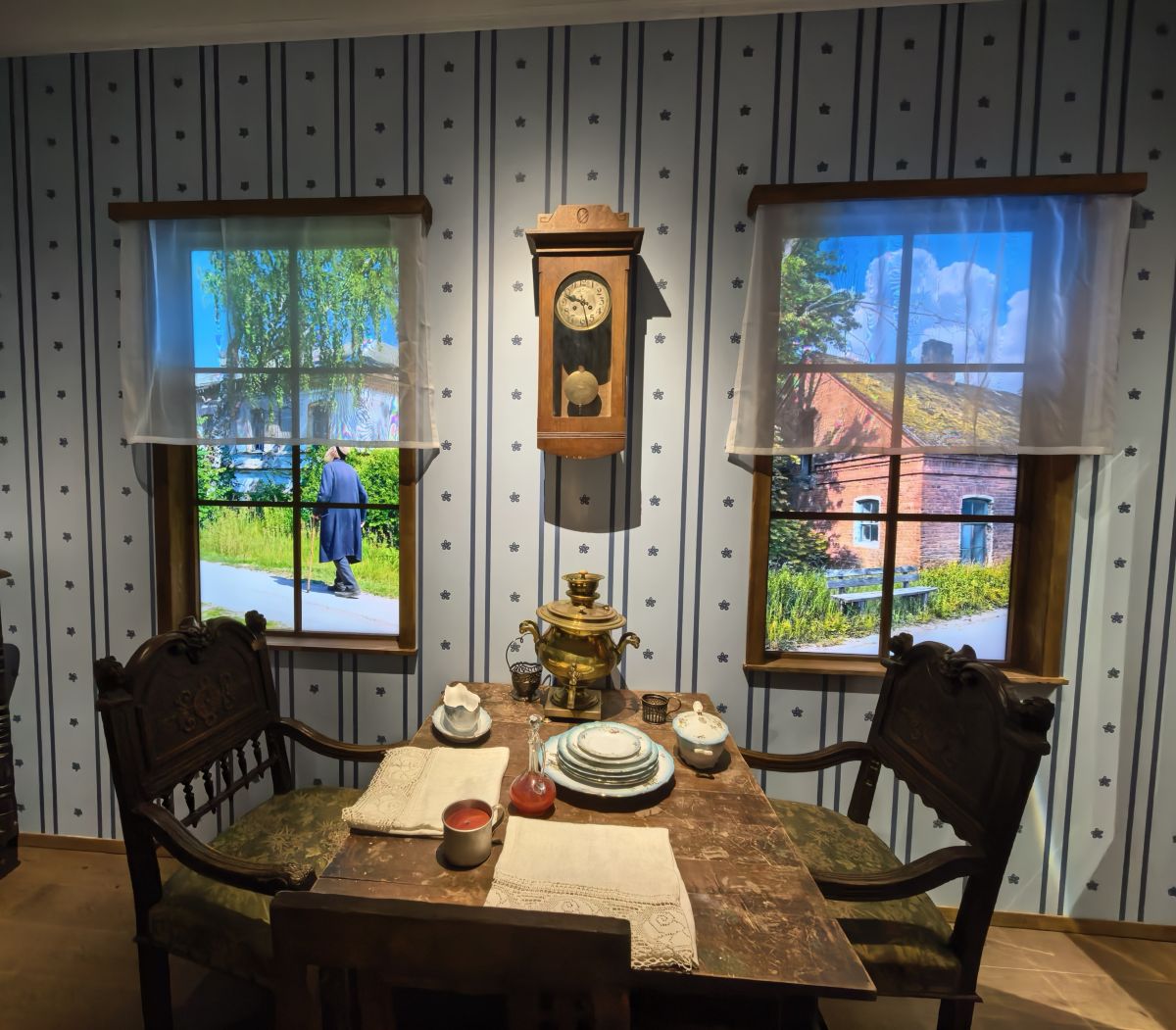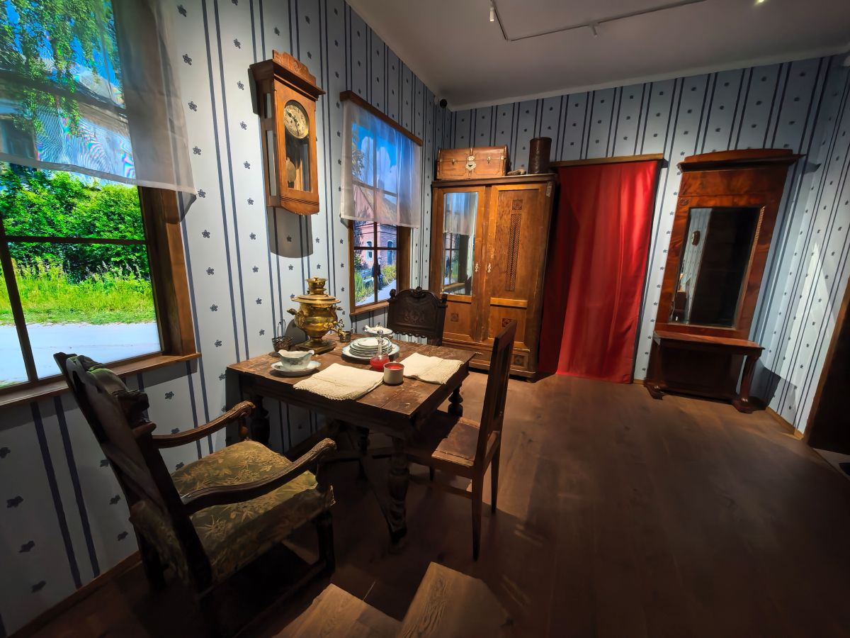 Почувствовать атмосферу, любимую мастером, можно в «Комнате семьи Шагал» — воссозданный интерьер с подлинными предметами мебели из дома художника в Витебске.
