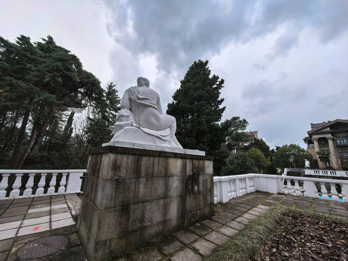 Широкие пролёты лестниц каскадом спускались вниз к морю. А вокруг всего этого архитектурного великолепия был высажен сад, где круглый год должны были цвести и радовать глаз экзотические цветы, деревья и растения. В этом саду у фонтана были установлены гигантские скульптуры.