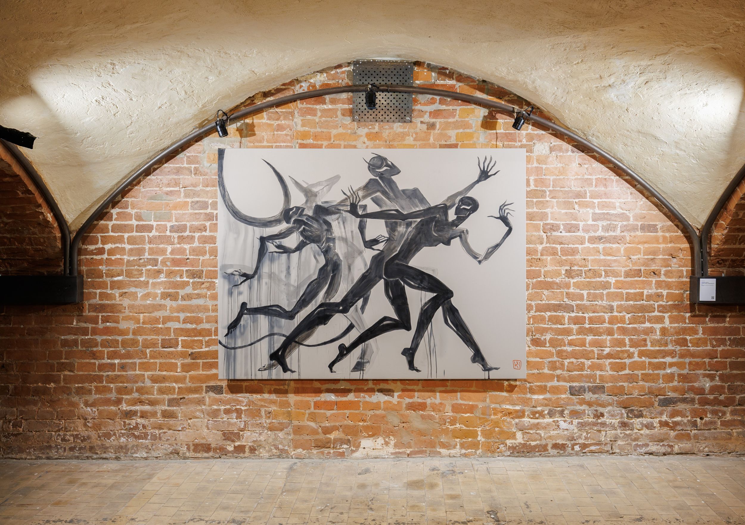Я называю ее «Присвоение танца». Сначала я иду на репетиции к танцовщикам, либо к спортсменам на тренировки. Быстрыми скетчами зарисовываю иероглиф движения. Потом перевожу их в графику тушью, затем это все переносится на холсты. Техника у меня как в иконописи, иконописи-тханкописи, когда сначала создаются точные выверенные контуры кистью, технически это сложно.