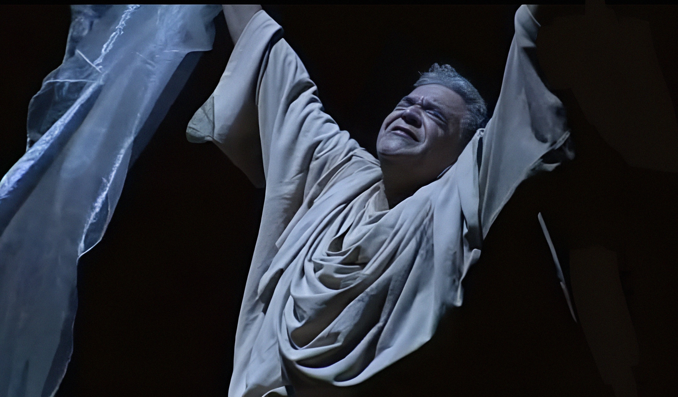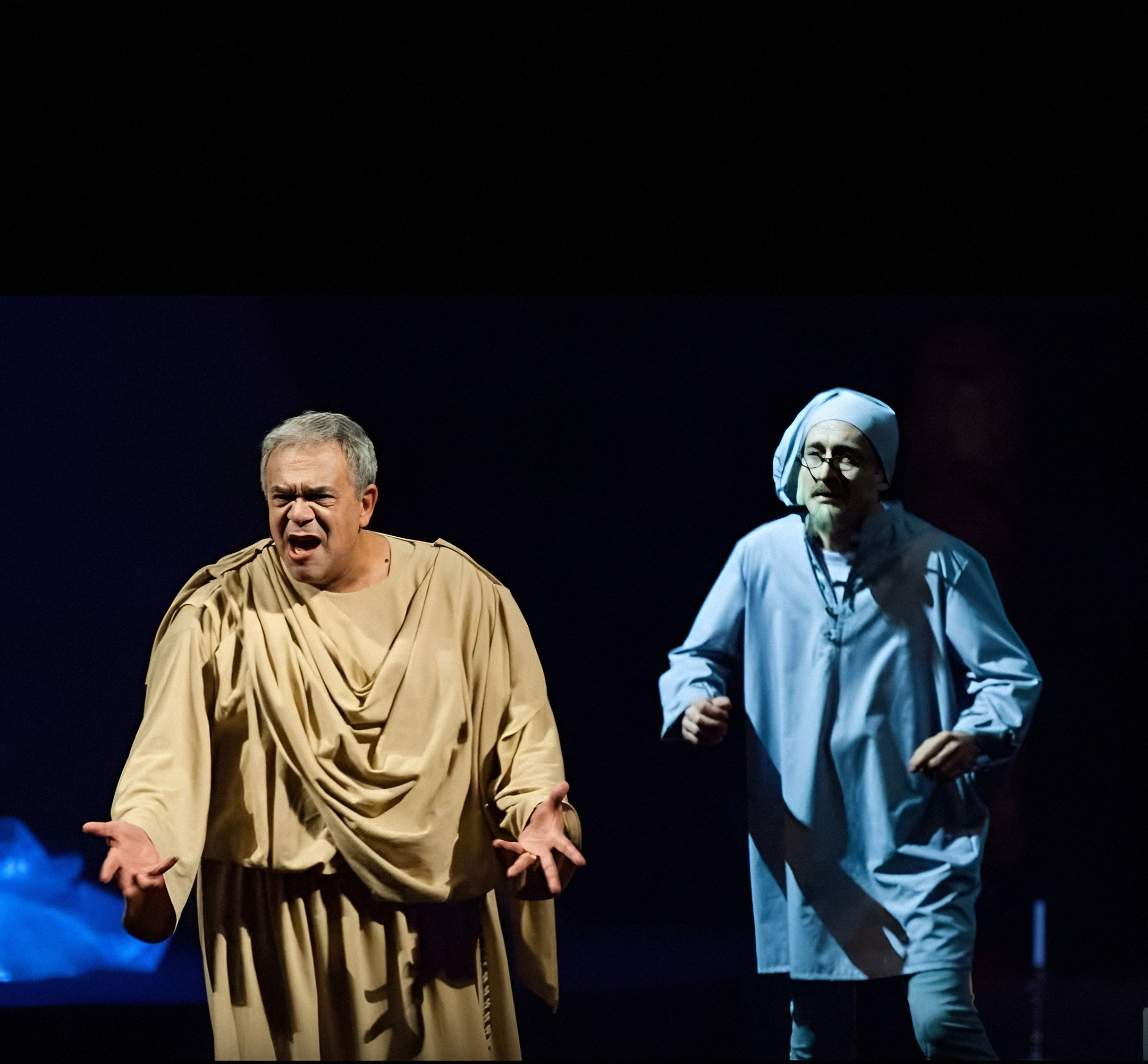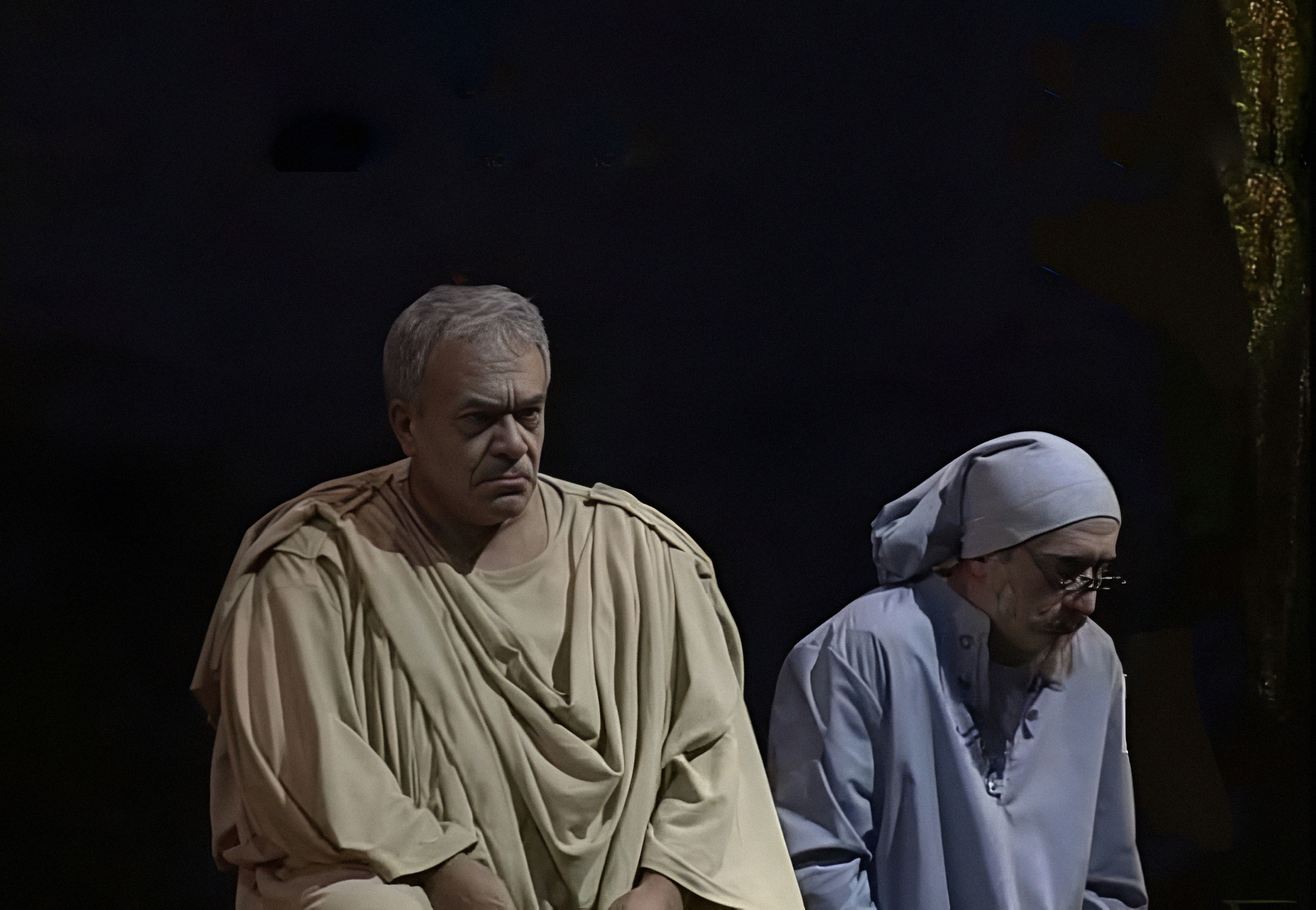 Пьеса Чехова дополнена в спектакле его высказываниями о театре. Невозможно не вспомнить здесь и «Костюмера» Харвуда — та же сцена закулисья, те же старики, те же трагикомические бормотания о славе. Но чеховский Светловидов — не просто выгоревший гений. Он — Калхас, древнегреческий жрец и прорицатель. Его пророчество — это не предупреждение, а постфактум. Всё уже случилось. Театр, каким он был — умер. Актёры остались. Игра — нет.