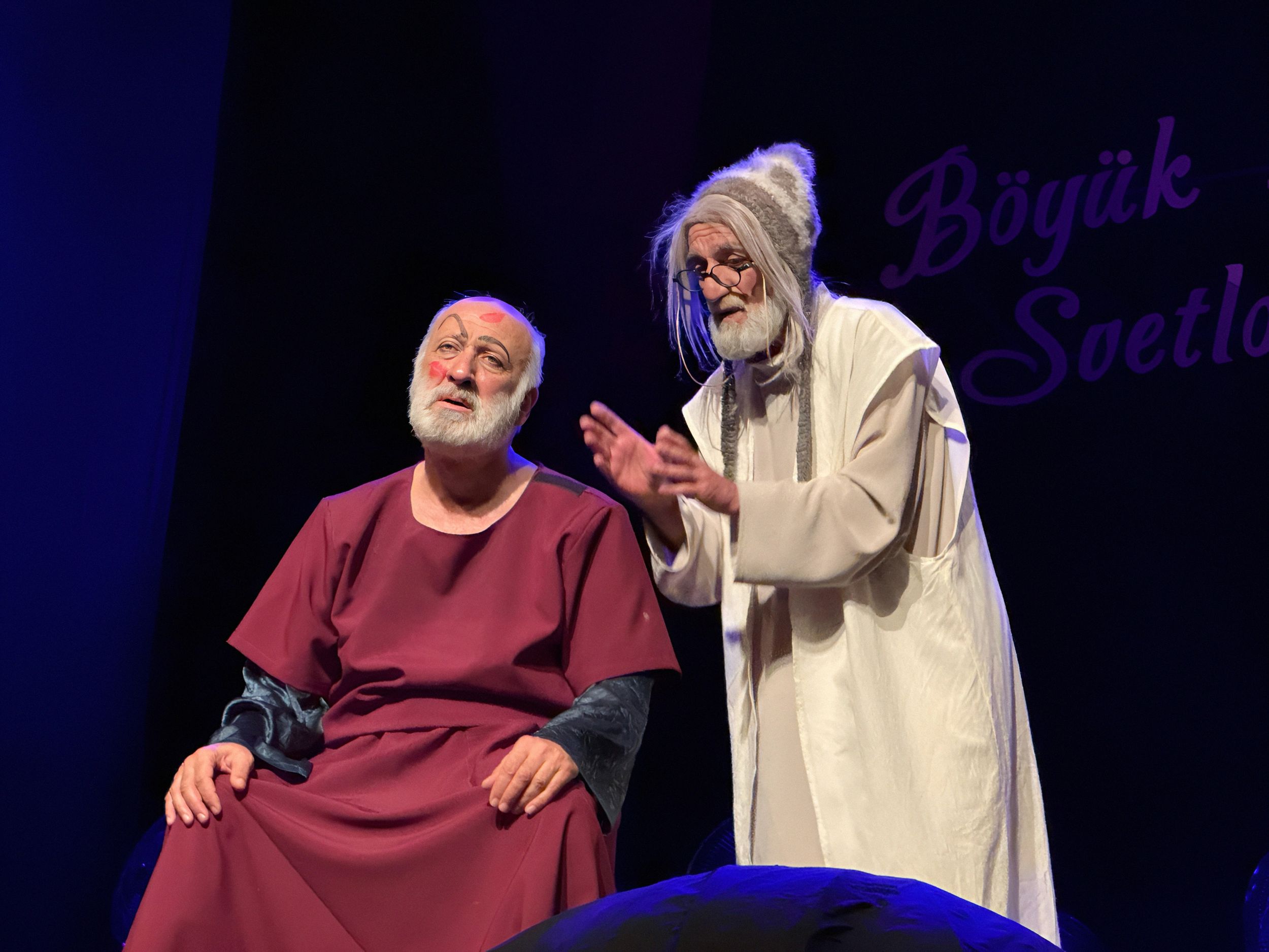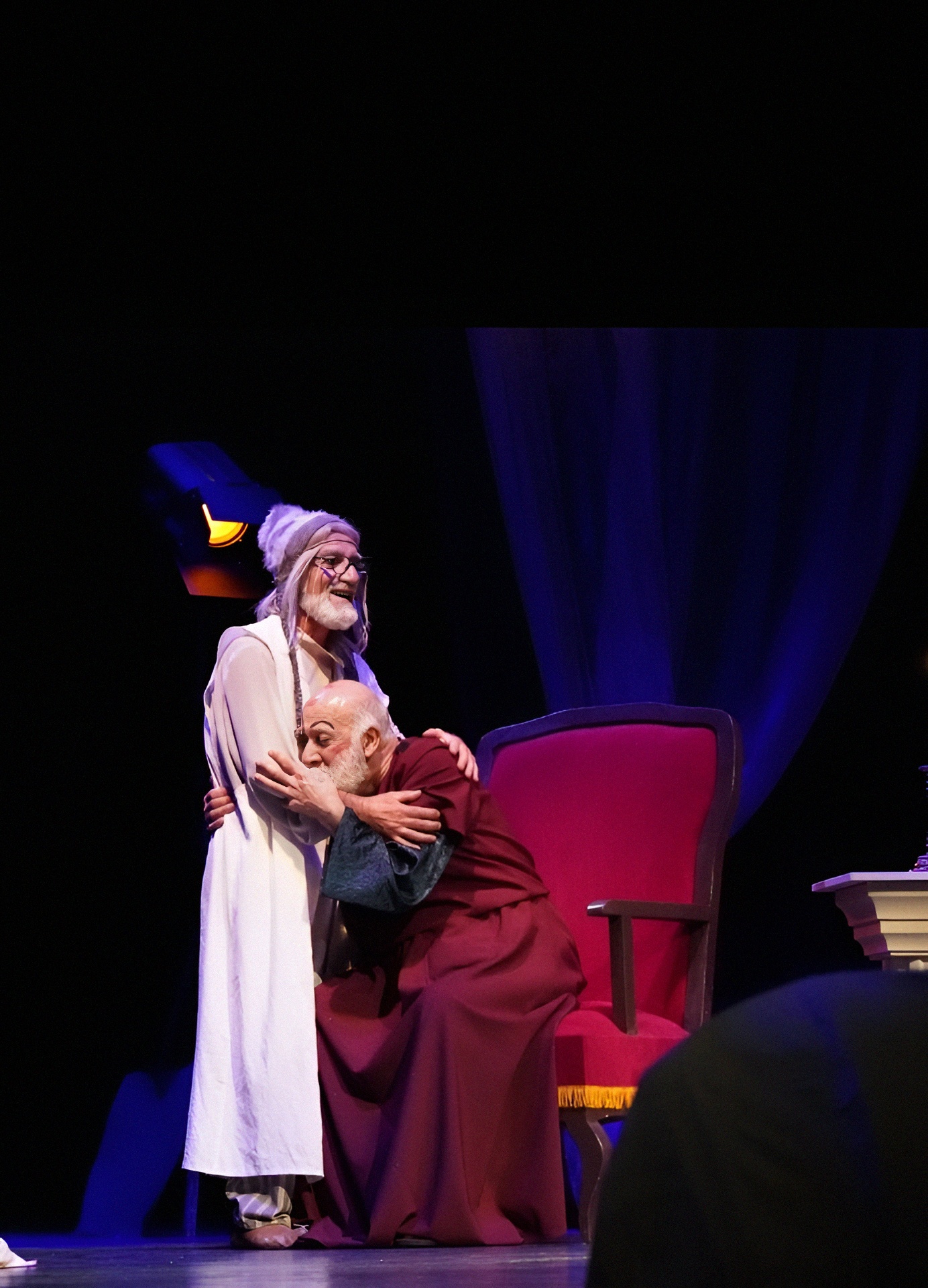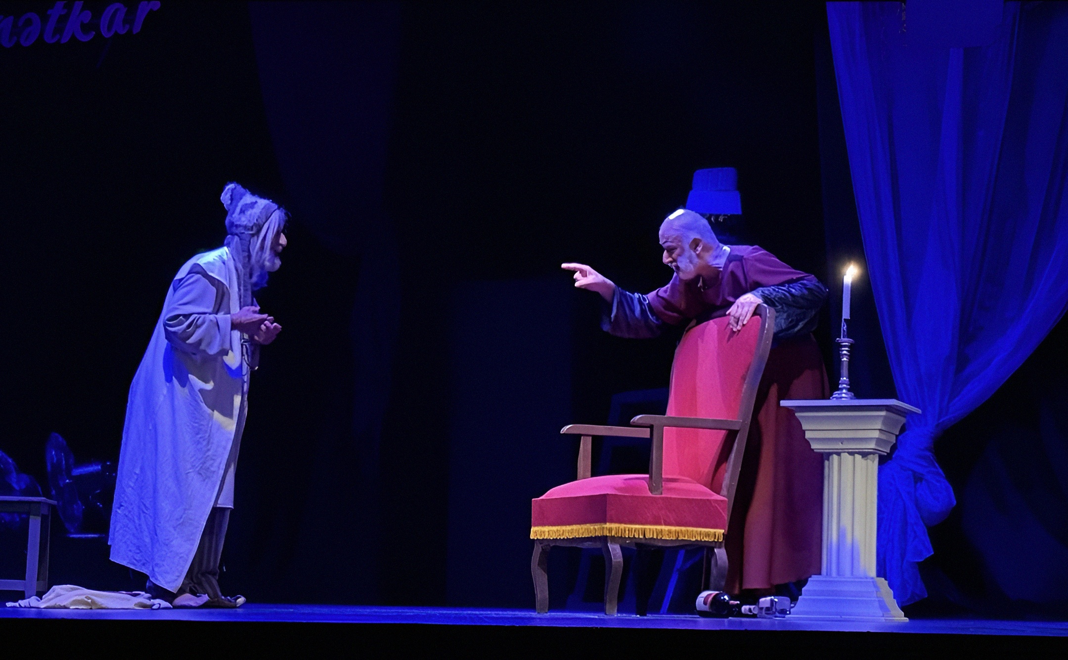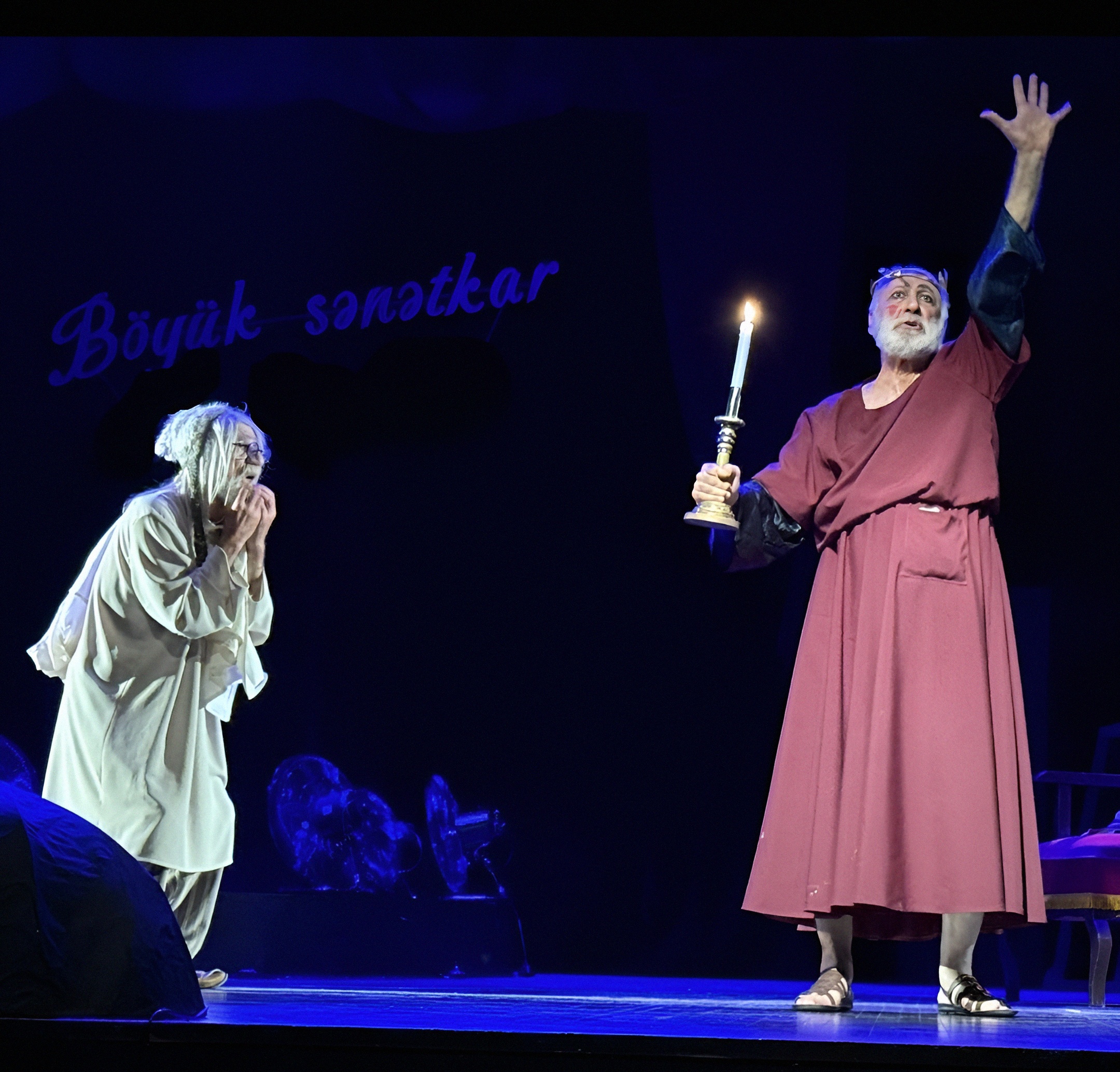 Светловидова играет Ханлар Гашымзаде. Его герой — не просто забытый актёр, забывающий текст. Это не артист, перебирающий золотую летопись ролей. В нём угадывается нерастраченный, недоверенный ему репертуар, и шекспировские монологи из его уст звучат как «Я Гамлета в безумии страстей, который год играю для себя»… Он произносит монологи из Пушкина, Грибоедова, вспоминает любовные драмы, и всё это звучит так, будто он репетирует не спектакль, а собственную смерть. Суфлёра играет Абульфат Салахов, и именно он становится точкой устойчивости: тот, кто помнит текст, удерживает ход времени, удерживает самого героя. Без суфлёра театр молчит, без него актёр — это просто старик в костюме.