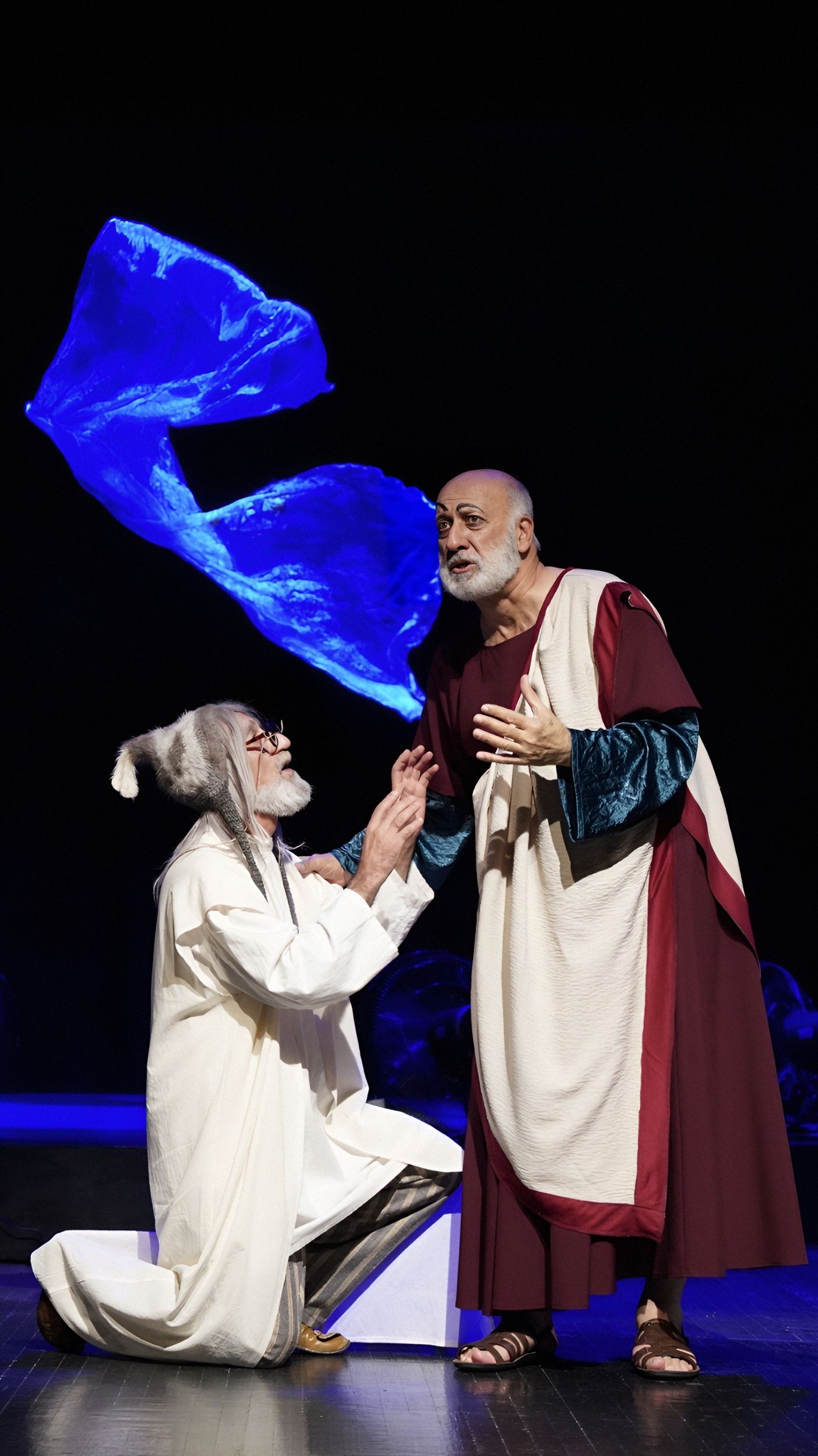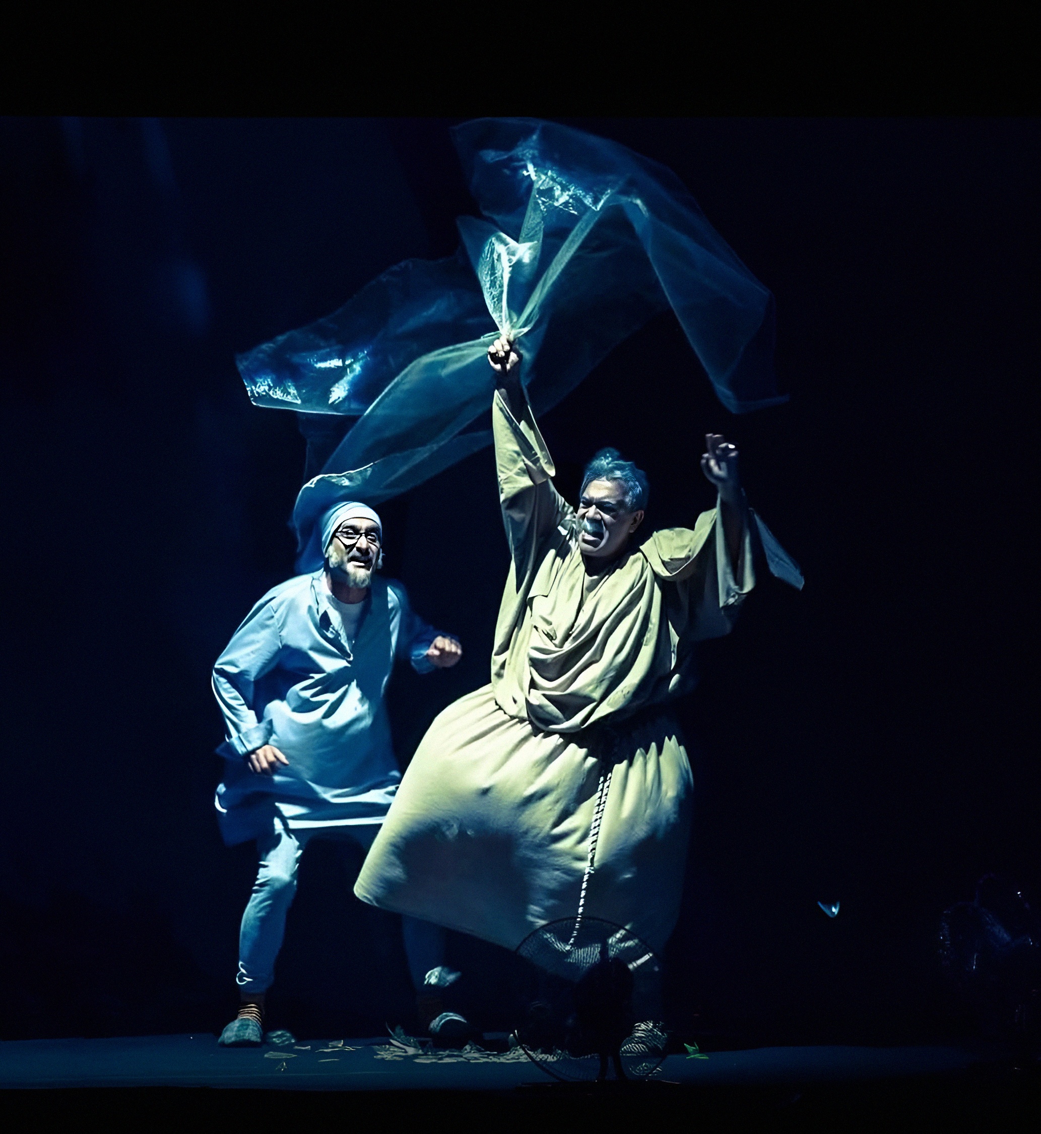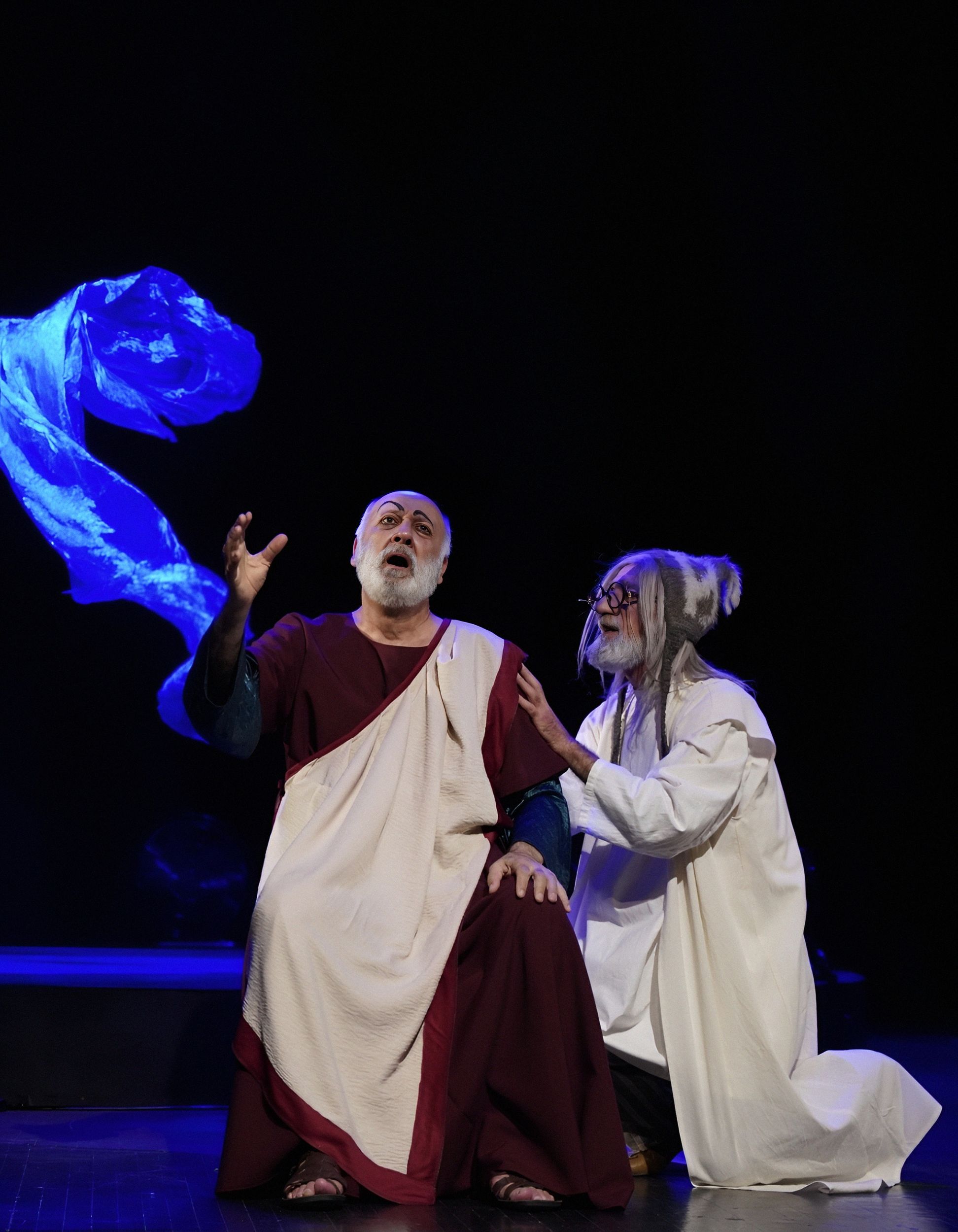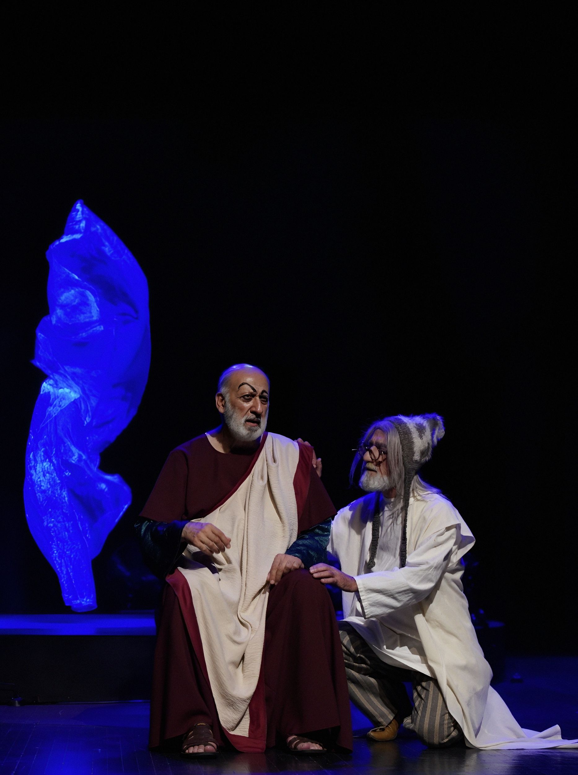 Светловидова играет Ханлар Гашымзаде. Его герой — не просто забытый актёр, забывающий текст. Это не артист, перебирающий золотую летопись ролей. В нём угадывается нерастраченный, недоверенный ему репертуар, и шекспировские монологи из его уст звучат как «Я Гамлета в безумии страстей, который год играю для себя»… Он произносит монологи из Пушкина, Грибоедова, вспоминает любовные драмы, и всё это звучит так, будто он репетирует не спектакль, а собственную смерть. Суфлёра играет Абульфат Салахов, и именно он становится точкой устойчивости: тот, кто помнит текст, удерживает ход времени, удерживает самого героя. Без суфлёра театр молчит, без него актёр — это просто старик в костюме.