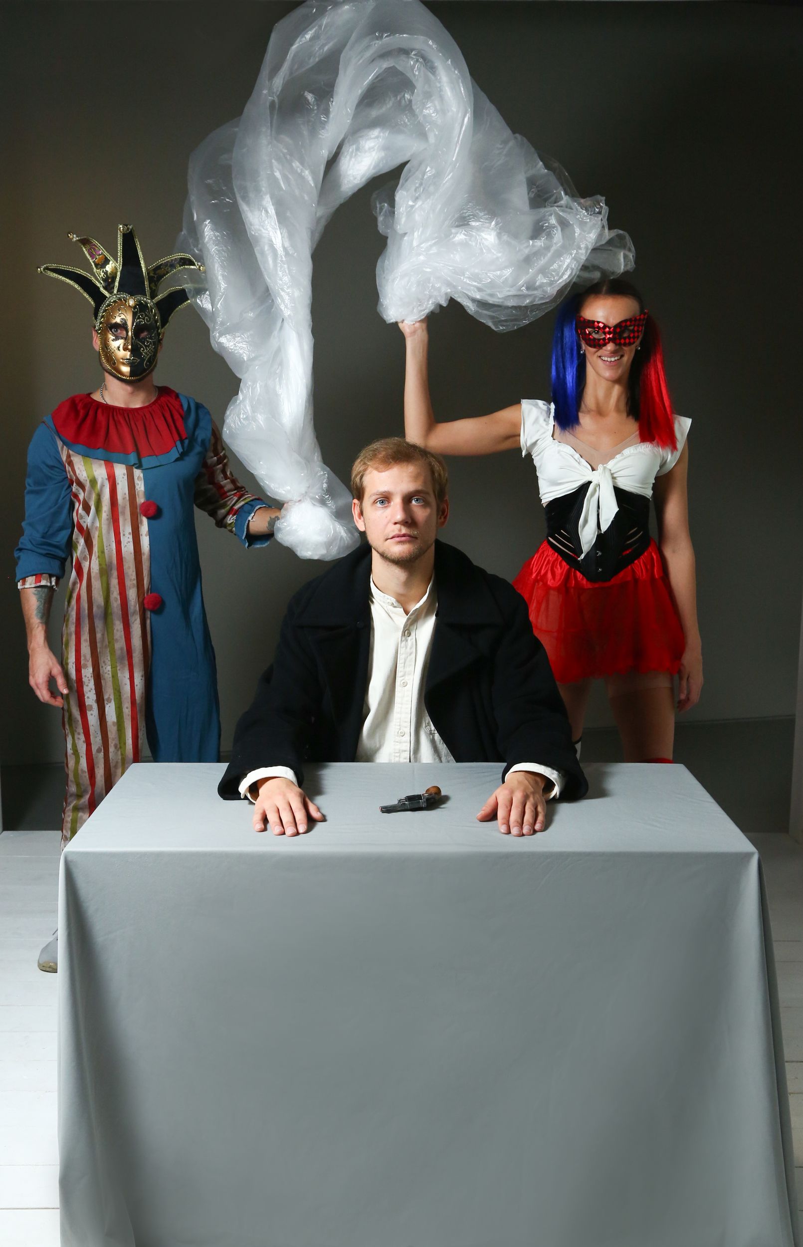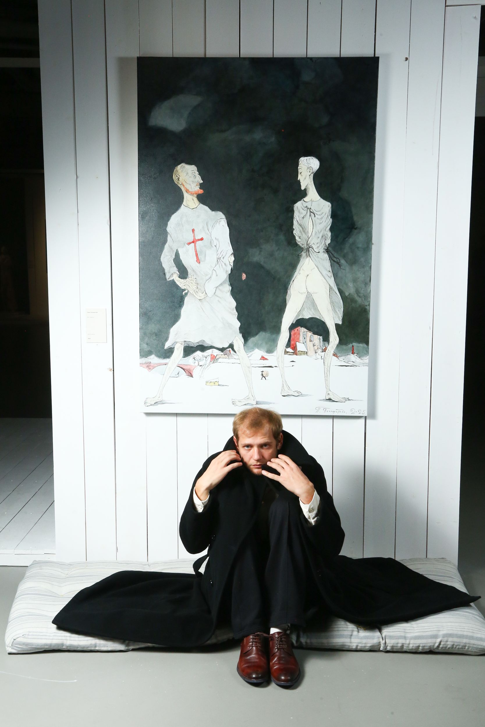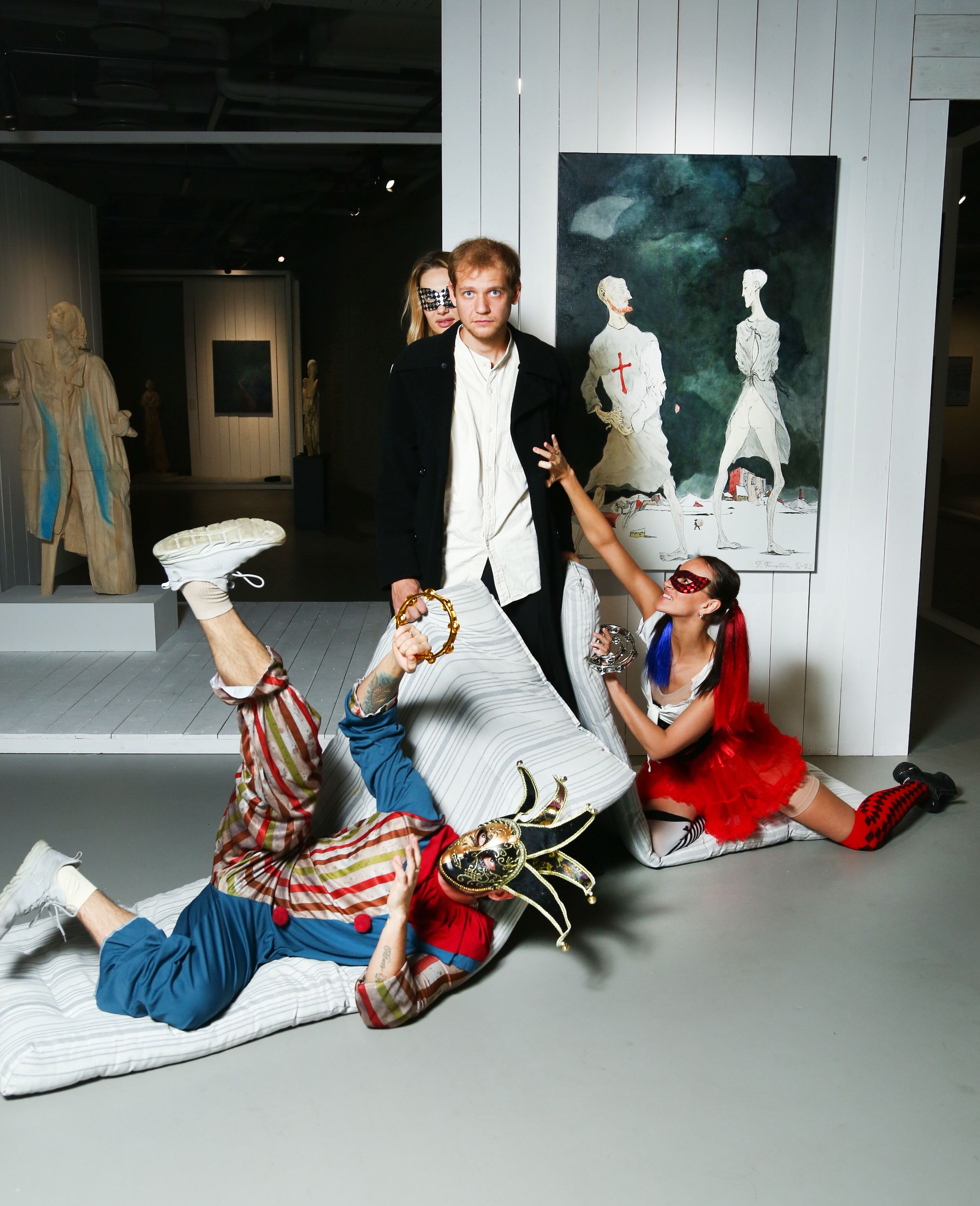 Перед посещением спектакля полезно заглянуть на выставку «Сон смешного человека» в галерее Stella Art Foundation и познакомиться с работами Павла Пепперштейна, Бориса Свешникова и Алексея Панькина — это поможет по-другому взглянуть на постановку и заметить, как современное искусство пересекается с драматическим.