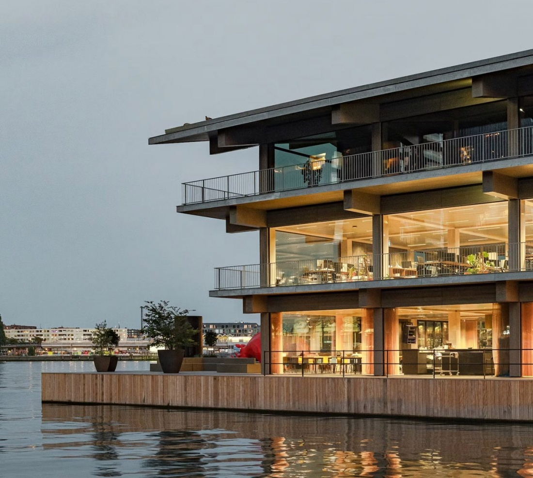Офисы на воде решают сразу несколько задач современных мегаполисов: борьбу с перенаселенностью, адаптацию к климатическим изменениям и растущий спрос на экологичные и технологичные здания. Этих же принципов придерживаются и в голландском архитектурном бюро Powerhouse Company, благодаря которому ещё несколько лет назад в роттердамской гавани Рейнхавен появился трёхэтажный Floating Office.