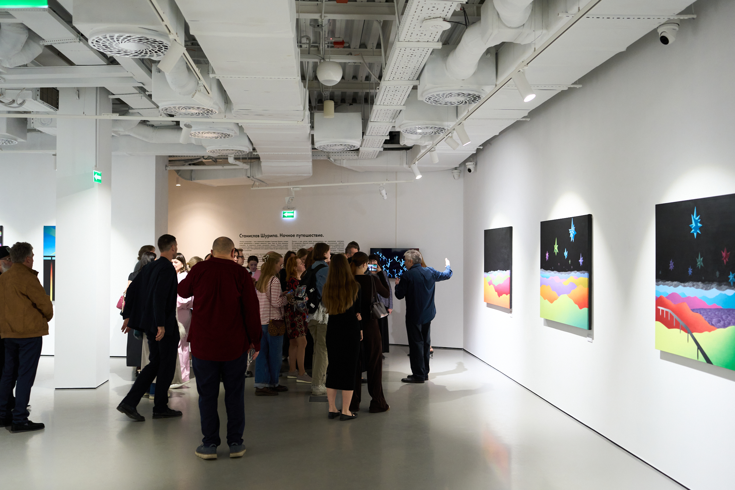 Станислав Шурипа в «Ночном путешествии» формально остается в жанре пейзажа, но его пейзажи — это и есть те самые балконы в космос. Фрагмент ландшафта, обычно служащий декорацией, вдруг увеличивается до размеров вселенной, занимая весь передний план. Это тот самый момент, когда пятно берет власть в свои руки. Цвет фона — от беспросветной тьмы до ядовито-ярких вспышек — маркирует стадии сна. Шурипа ловит миг, когда законы природы меняются, знакомые образы трансформируются, а тьма из фона становится режиссером новой реальности. Его цикл «Терраформинг» — это и есть об этом диалоге: мы не покоряем новые миры, а договариваемся с их природой, с их первоначальным, хаотичным «пятном».