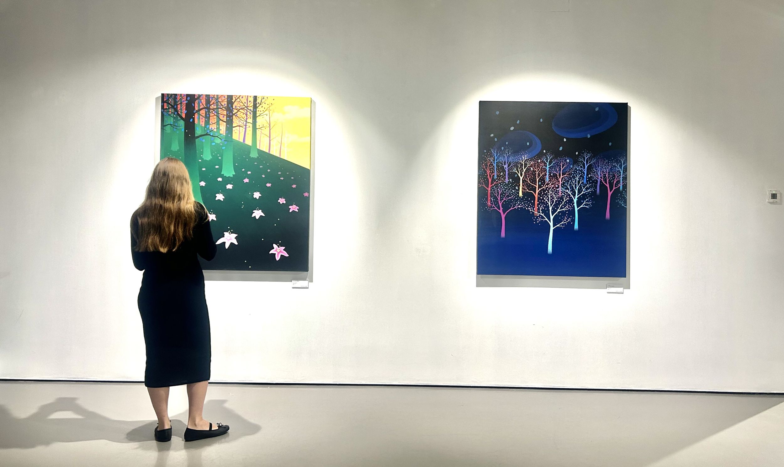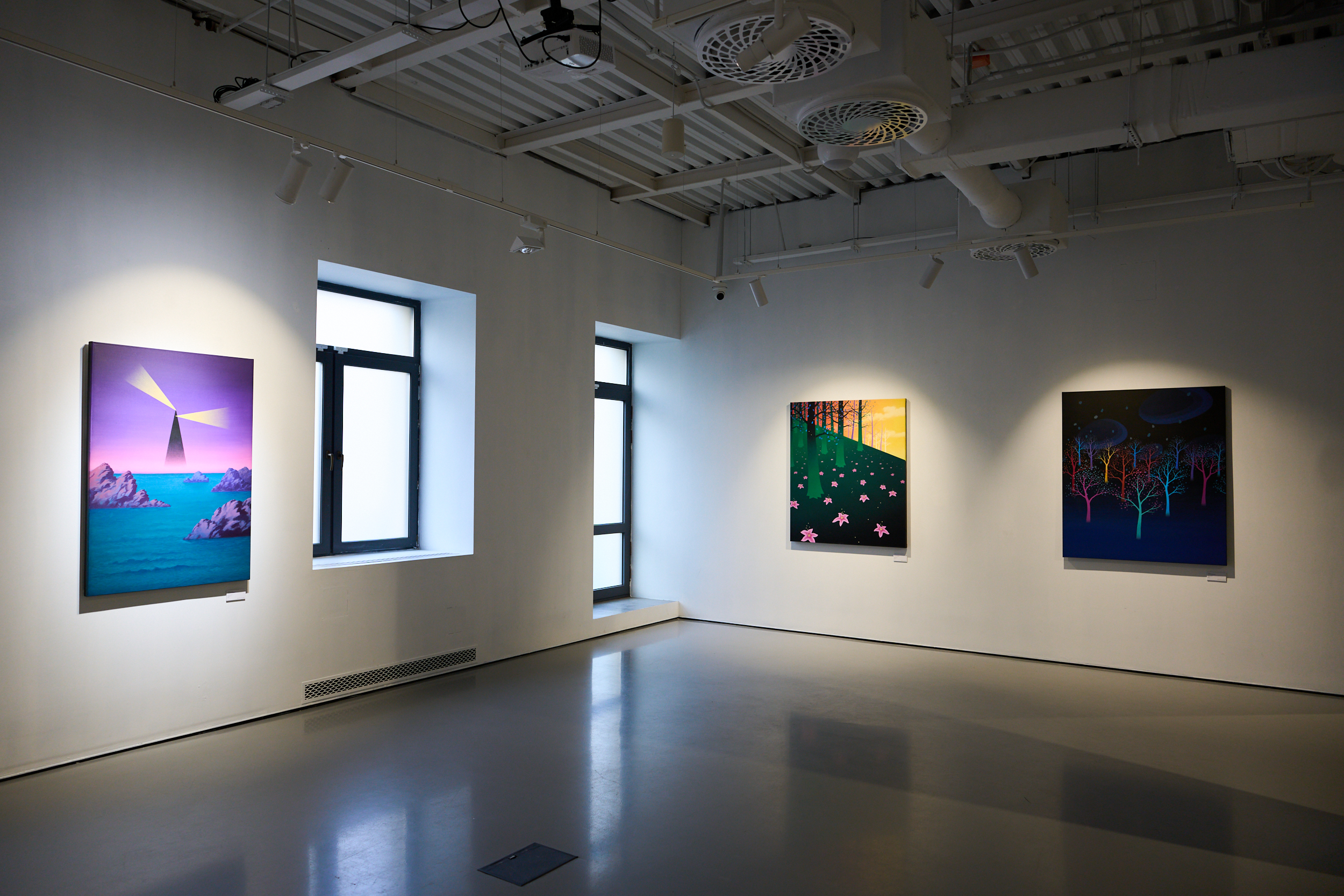 Работы Станислава Шурипы демонстрируют особый мир, балансирующий на грани реальности и сновидений через живописные полотна. Выставка удачно открылась накануне осеннего равноденствия, когда в ближайшие полгода тьма поглотит землю, а главное действующее лицо на картинах как раз она и есть. Тьма заполняет все вокруг и на ее фоне возникают деревья, цветы и прочие геометрические формы.