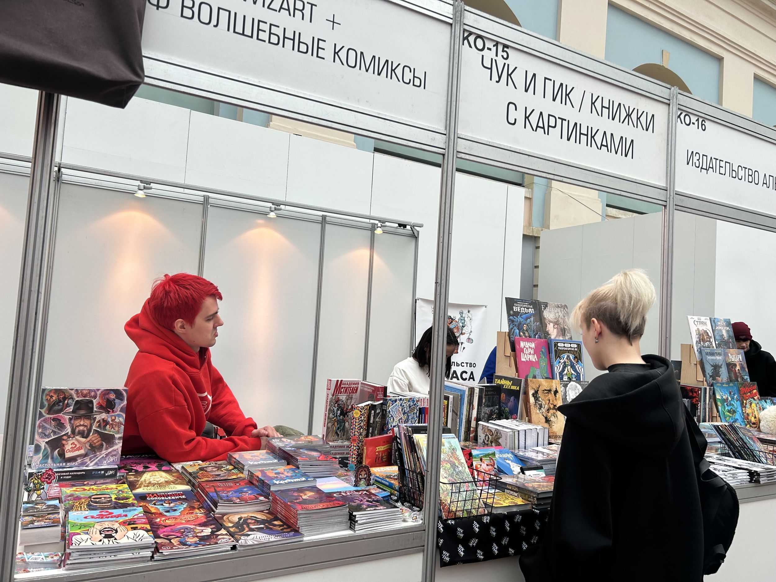 А теперь — про комиксы. 25 рабочих мест на аллее авторов. Комиксы — не жанр, это форма, напоминают знающие люди. Классика, мистика, ужасы, биографические и исторические графические романы. Издательство «Кроссовер» выпустили семейное чтение, где и детям не скучно, и взрослым не стыдно. Придумали даже альтернативу Бэтмену. Художники творили на глазах, можно было заказать скетч, уйти с уникальным рисунком. Тиражная иллюстрация жива!