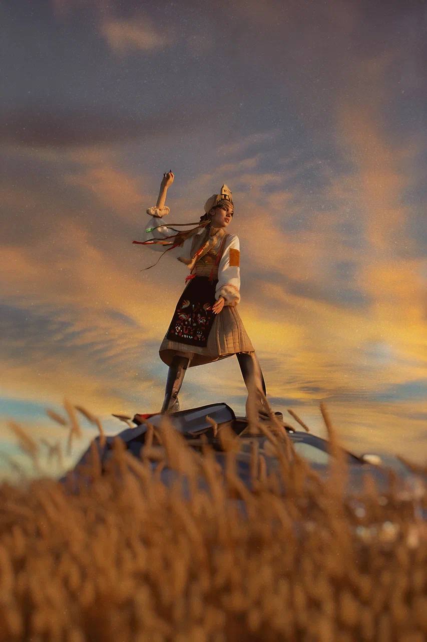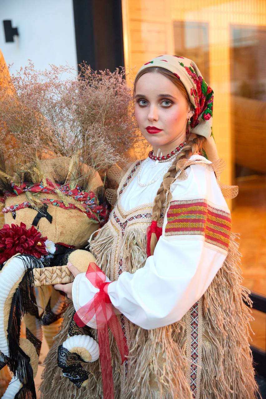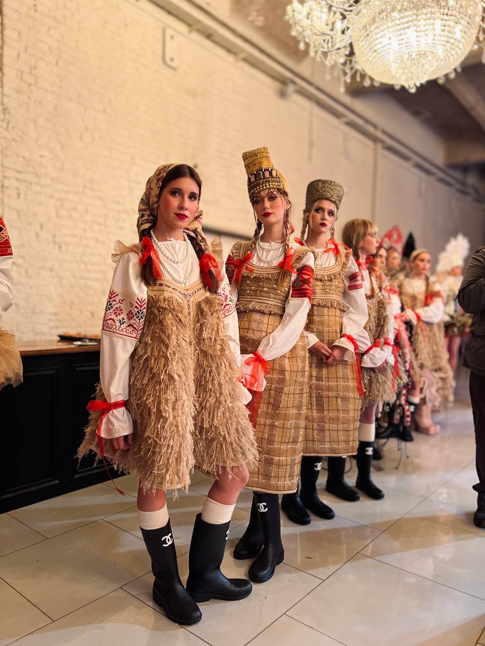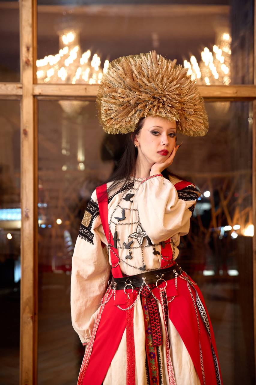 Работая над коллекцией «Пшеничный обоз», мы искали баланс между аутентичностью и современностью. Оригинальные вышивки начала XIX века из Нижегородской и Архангельской областей вплетены в костюмы с современными силуэтами. Пшеничные колосья, солома, сухоцветы — всё то, что ассоциируется с праздником урожая, достатком, радостью. Получился театральный эффект: костюмы выглядят исторически, но носятся актуально. Красные орнаменты на белом льне, корсеты с имитацией плетения из соломы, юбки-пачки с декором из колосьев. Это не историческая реконструкция — это диалог с традицией, где обе стороны имеют равный голос.