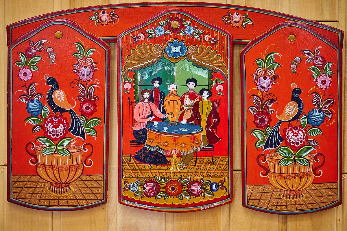 Хохломская роспись делится на «верховую» и «фоновую». Верховая — когда золочёная поверхность не закрашивается, а по ней сочными мазками наносится рисунок. Фоновая — когда художник сначала планирует композицию, наносит контуры листьев и ягод, а затем заливает фон чёрным или красным. Есть ещё «кудрина» — абстрактная, затейливая, где у птицы вместо перьев из хвоста растут травы. В XVI веке кто-то придумал эту систему, и она работает до сих пор. Попробуйте так же про айфон сказать.
