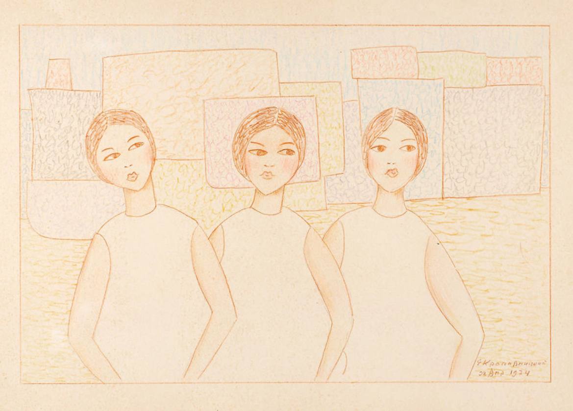На очереди — год, когда «Три девушки» созданы. Это уже поздний Кропивницкий, работал он тогда преимущественно в графике. Женские портреты — его фишечка. Сами можете проверить: в следующий раз девушку Кропивницкого вы «узнаете из тысячи», как в той песне.