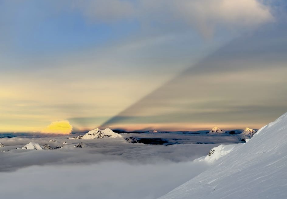 Так и сделали. А утром — нам за это виды потрясающие. Все облака толстым слоем под ногами. Словно первый снег после мокрого ноября в городе. Светло и высоко. Вниз — самое сложное оказалось через вверх стремящихся пробиться. Чуть до прямого воздействия не дошло. Лезут, чёрти, по спусковым веревкам. Медленно. Коалы, блин. У нас внизу ром стынет, а они тут, понимаешь.