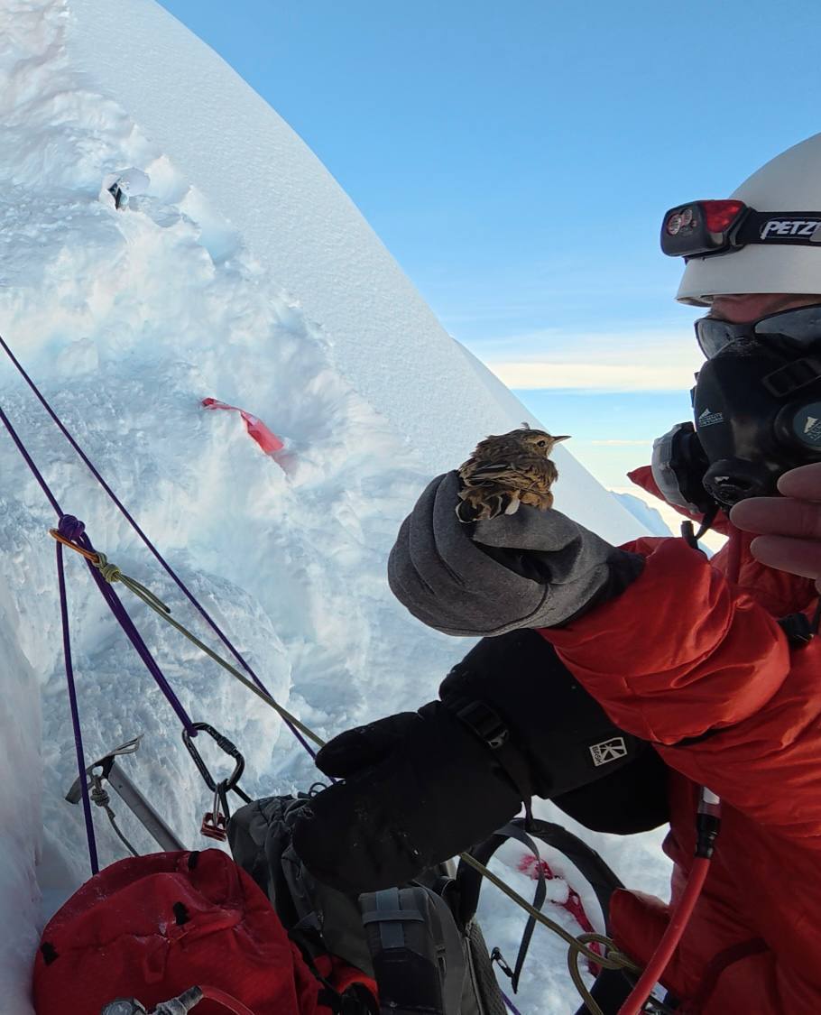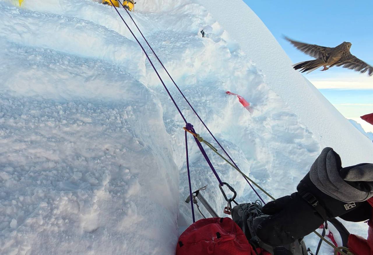 Вася на вершине. Догнал русскую двойку. Мы их знаем. Решает передать им воробья. Они вниз быстрее. Там — тепло. Отпустят.