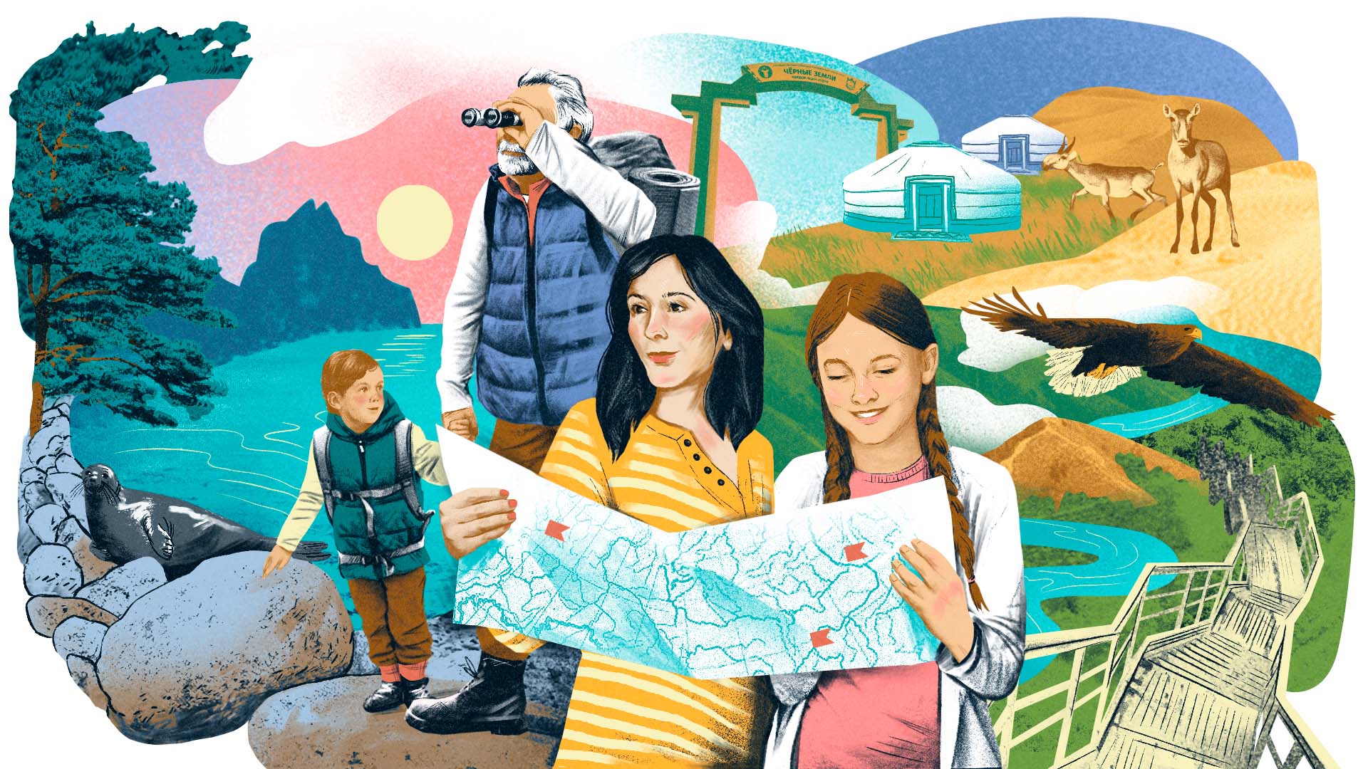 На «Чёрных землях» есть ещё несколько экотроп: весной можно любоваться перелётными птицами, редкими тюльпанами Шренка и солёными Меклетинскими озёрами с розовой водой. В визит-центре рассказывают об экосистемах и обитателях заповедника, знакомят с калмыцкой культурой и показывают найденные здесь археологические артефакты. А для тех, кто хотел бы увидеть закат в степи и звёзды над пустыней, есть кемпинг с палатками, благоустроенные жилые модули и даже настоящие юрты.