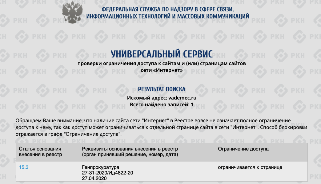 Обновление: 29 апреля Роскомнадзор вернул доступ к сайту издания Vademecum, после того как материал, вызвавший претензии был удален.