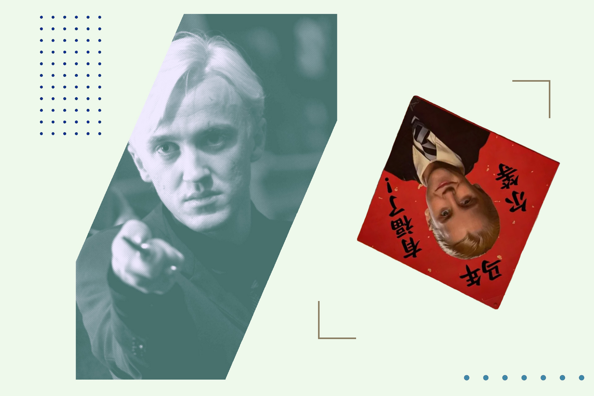 Причём образ Малфоя оказался встроенным не только во всякие безделушки, но и в компоненты праздника, имеющие сакральное значение. Так, в Китае принято в преддверии Нового года наклеивать на входные двери красные бумажные квадраты с иероглифом 福 (вы уже знаете, как он переводится), чтобы привлечь благополучие. Часто их даже переворачивают вверх ногами, потому что слово «перевёрнутое» (倒 dào) звучит так же, как «приходит» (到 dào). То есть перевёрнутый 福 буквально значит «удача приходит». Теперь же на месте иероглифа у некоторых китайцев — поттерианский блондин-хулиган.