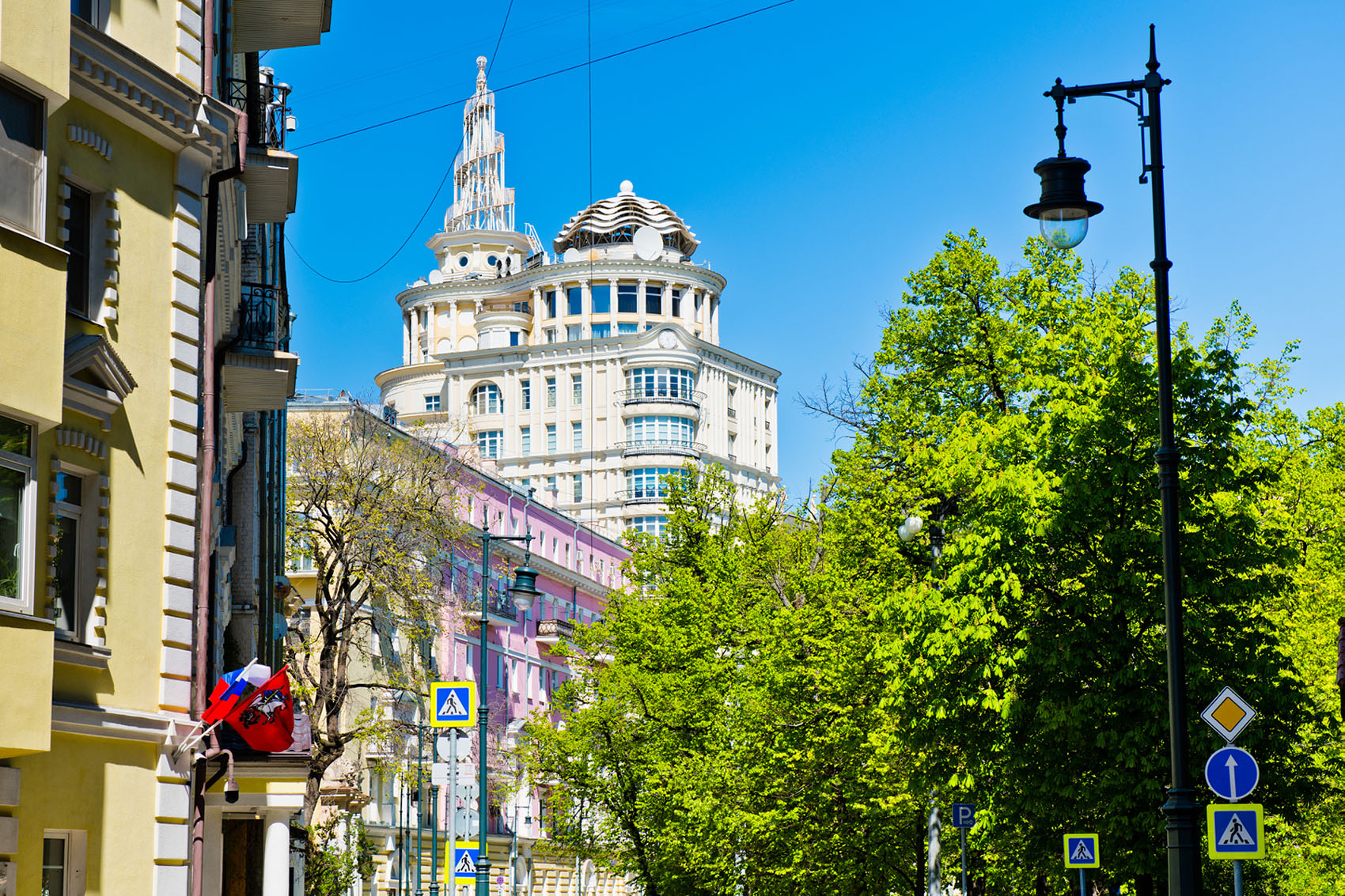 Да, стекла очень много, причем разных оттенков. Мы говорим о Москве, но на самом деле это касается всей России: в Томске прямо перед зданием администрации стоит такой дом, весь в синем стекле. Я думаю, что это отголосок нашего советского представления об американском или лондонском «сити»: небоскребы же чаще всего стеклянные — и Манхэттен, и Лондон застраивались в основном в 1980-е годы. И ладно бы просто стекло, но мы же «пацаны нормальные», а нормальному пацану без «колонки» трудно: прямо на этом стекле появляются гипсовые капители, пилястры. Часто это производит уже анекдотичное впечатление: «так плохо, что даже хорошо». Это касается, например, знаменитых домов в Петербурге, где между двумя корпусами ЖК втиснута церковь (имеется в виду ЖК «Зенит» возле Удельной — Прим.ред.).