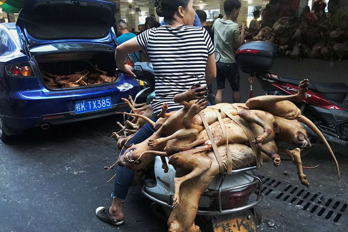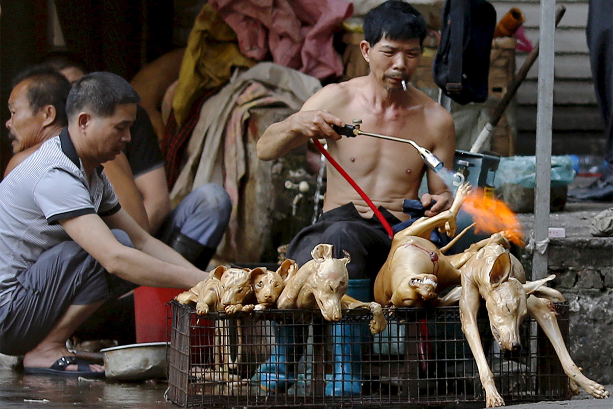 За десять дней фестиваля собачьего мяса в китайской провинции Юйлинь его посетители съедают 15 тысяч собак и кошек. Перед тем, как подать мясо, животных убивают с особой жестокостью: организаторы верят, что от этого мясо кошек и собак становится вкуснее. Несмотря на протесты по всему миру и призывы знаменитостей — например, Мэтта Дэймона и Рикки Джэрвейза — запретить фестиваль, он проходит уже девятый год