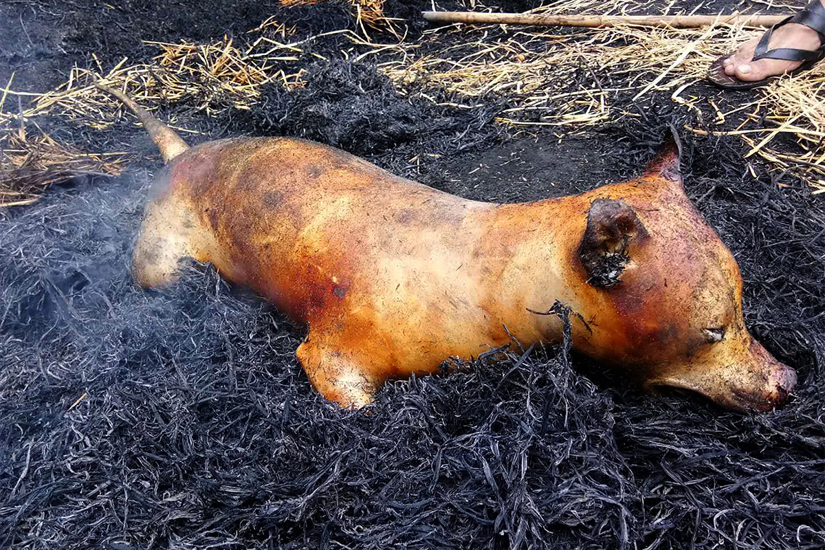 21 июня 2018 года. Первый день фестиваля собачьего мяса в Юйлинь. Туша собаки жарится в соломе. Днем раньше верховный суд Южной Кореи, где собаки традиционно употреблялись в пищу, объявил их убийство незаконным. Фото: AFP