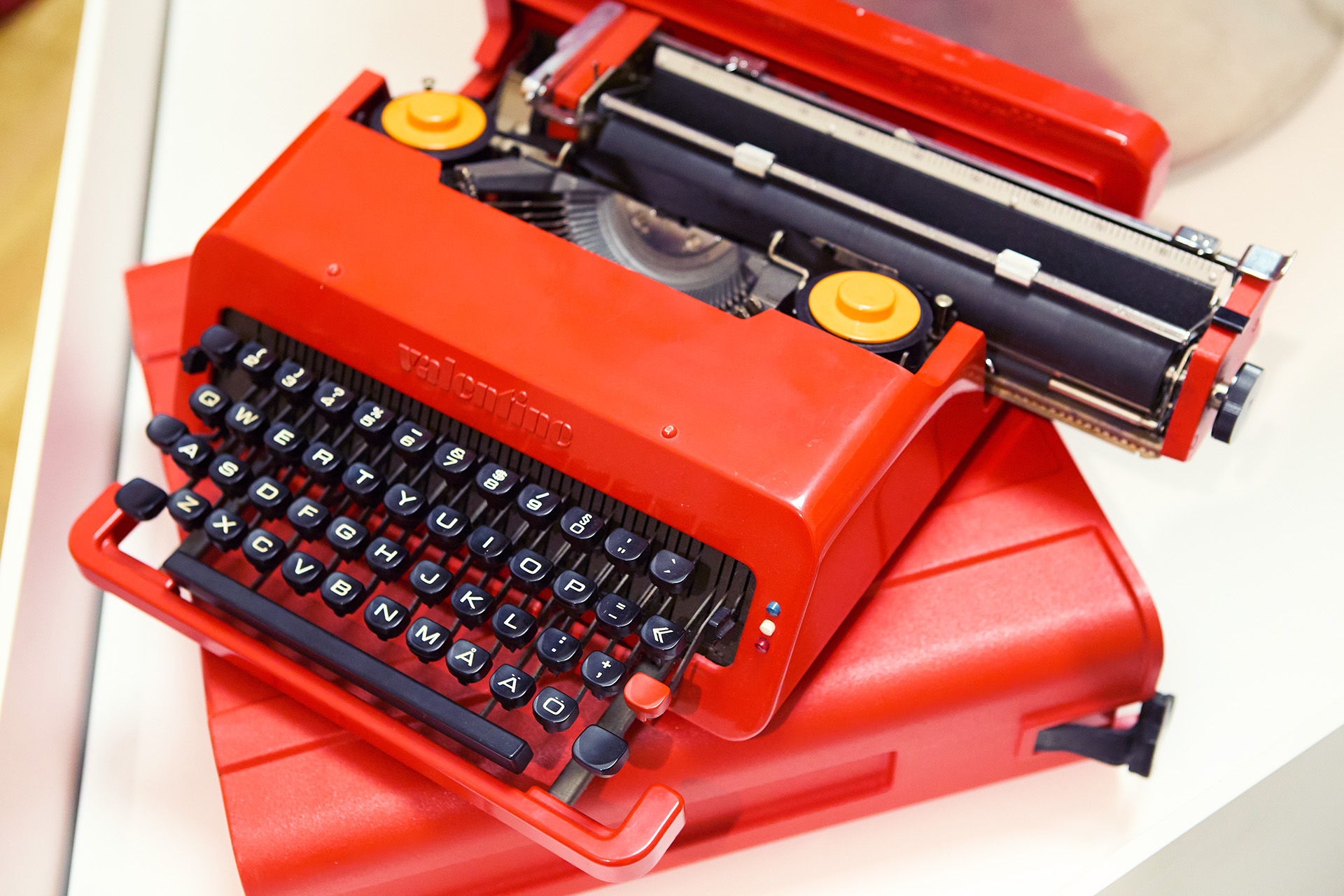 Среди культовых предметов на выставке особое место занимает печатная машинка Valentine — работа знаменитого итальянского дизайнера Этторе Соттсасса, основателя группы Memphis. Она стала настоящей иконой дизайна: яркая, лёгкая и портативная, благодаря пластику она превратилась из утилитарного прибора в стильный аксессуар. Valentine можно было взять с собой в кафе или поездку, что делало её символом свободы и вдохновения для писателей. Яркий цвет, гармоничные пропорции и необычная для своего времени мобильность обеспечили ей место в коллекциях всех ведущих музеев современного искусства и дизайна.