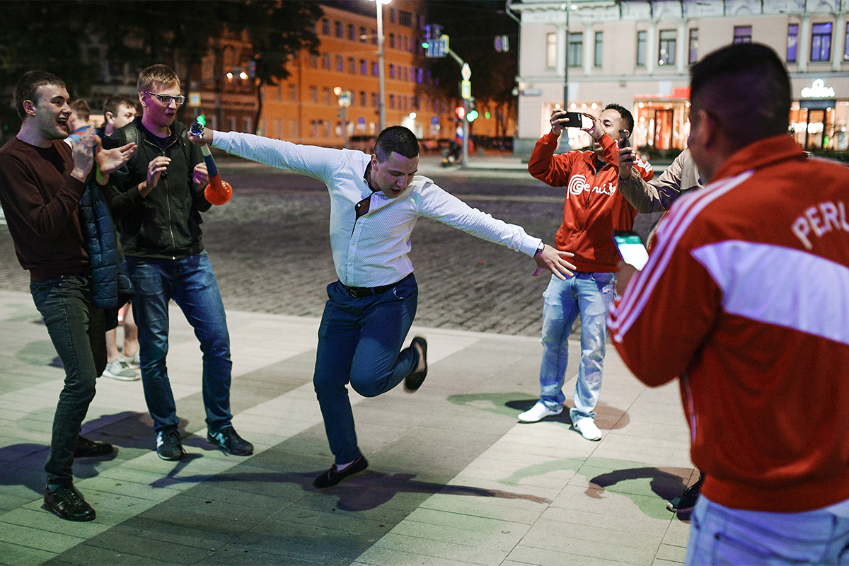 В 1/8 финала команды из группы А, в которой играет Россия, попадут на сборные из группы B, в которой выступают Испания, Португалия, Иран и Марокко. На фото: праздничная лезгинка в Екатеринбурге Фото: Владимир Астапкович/РИА Новости