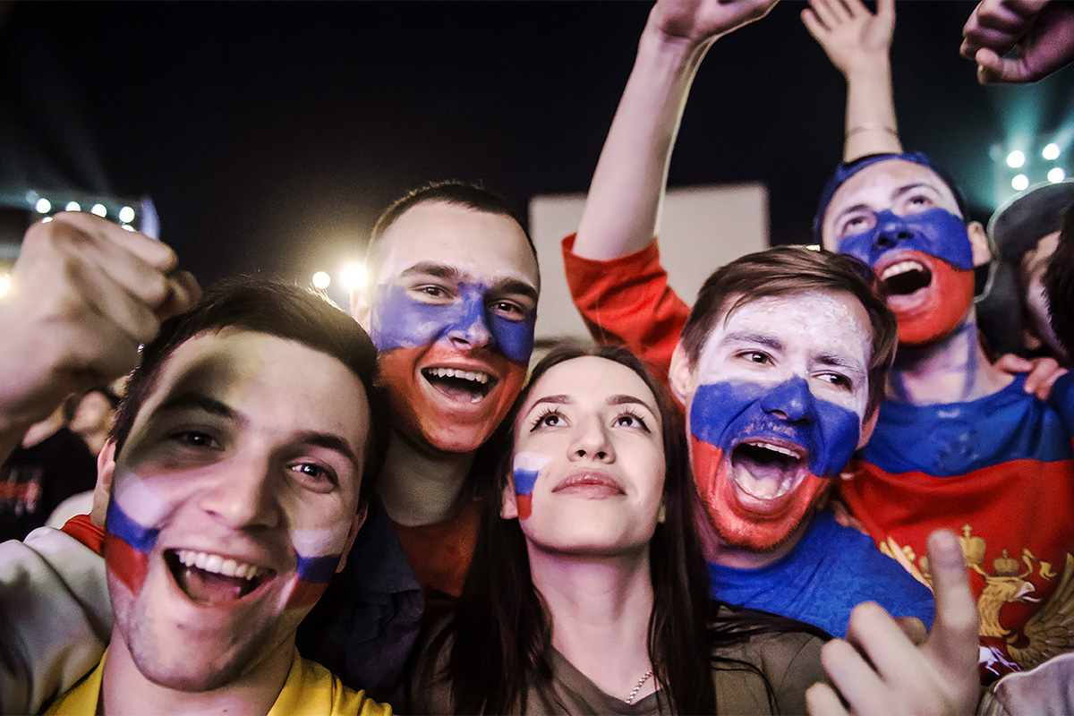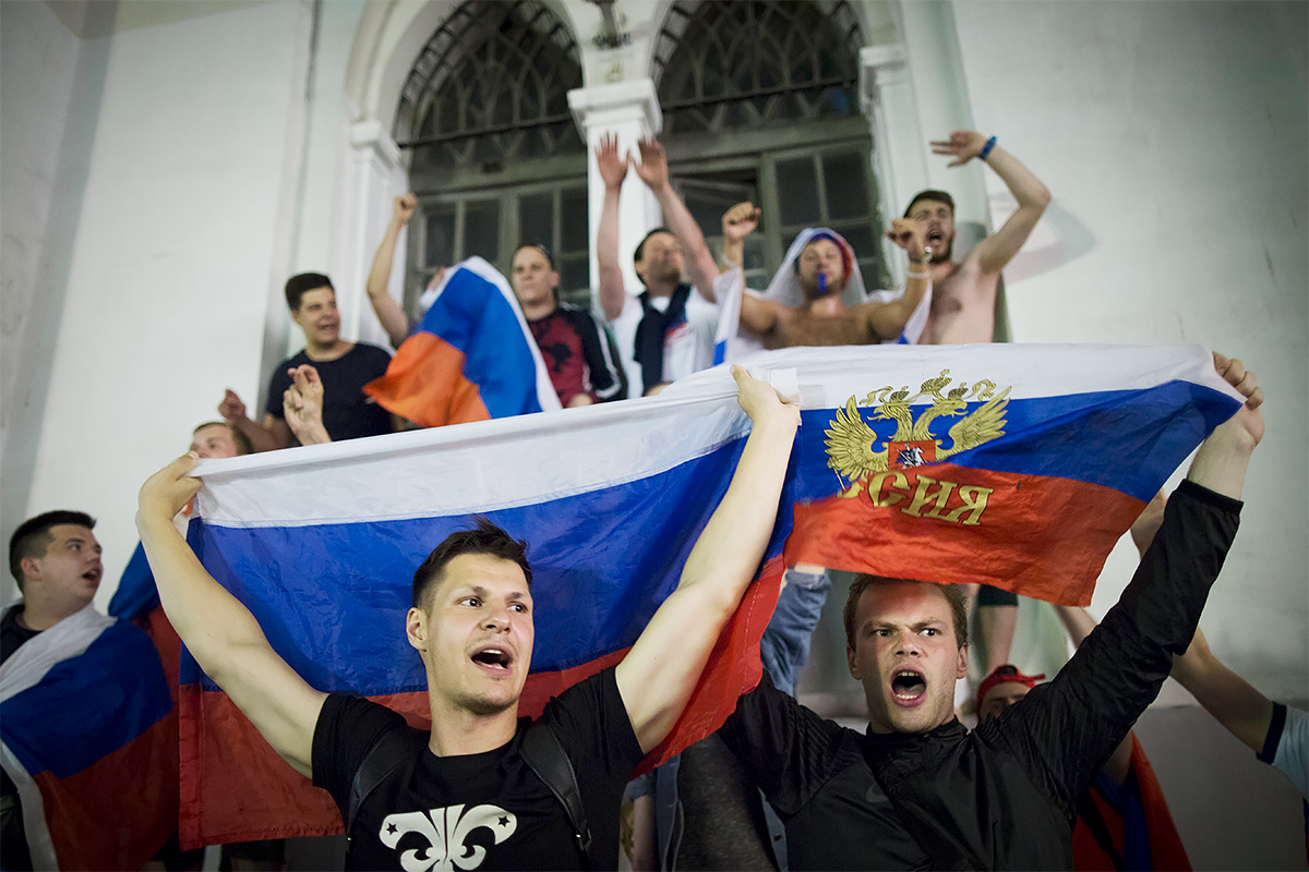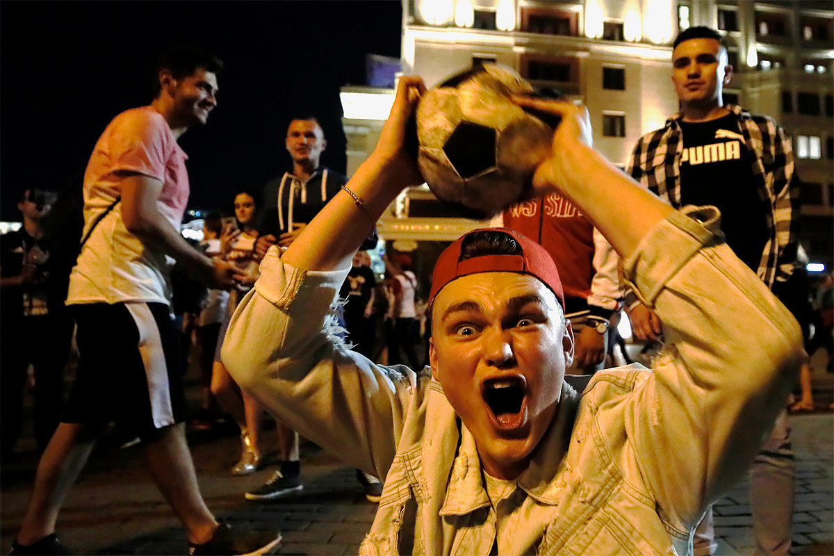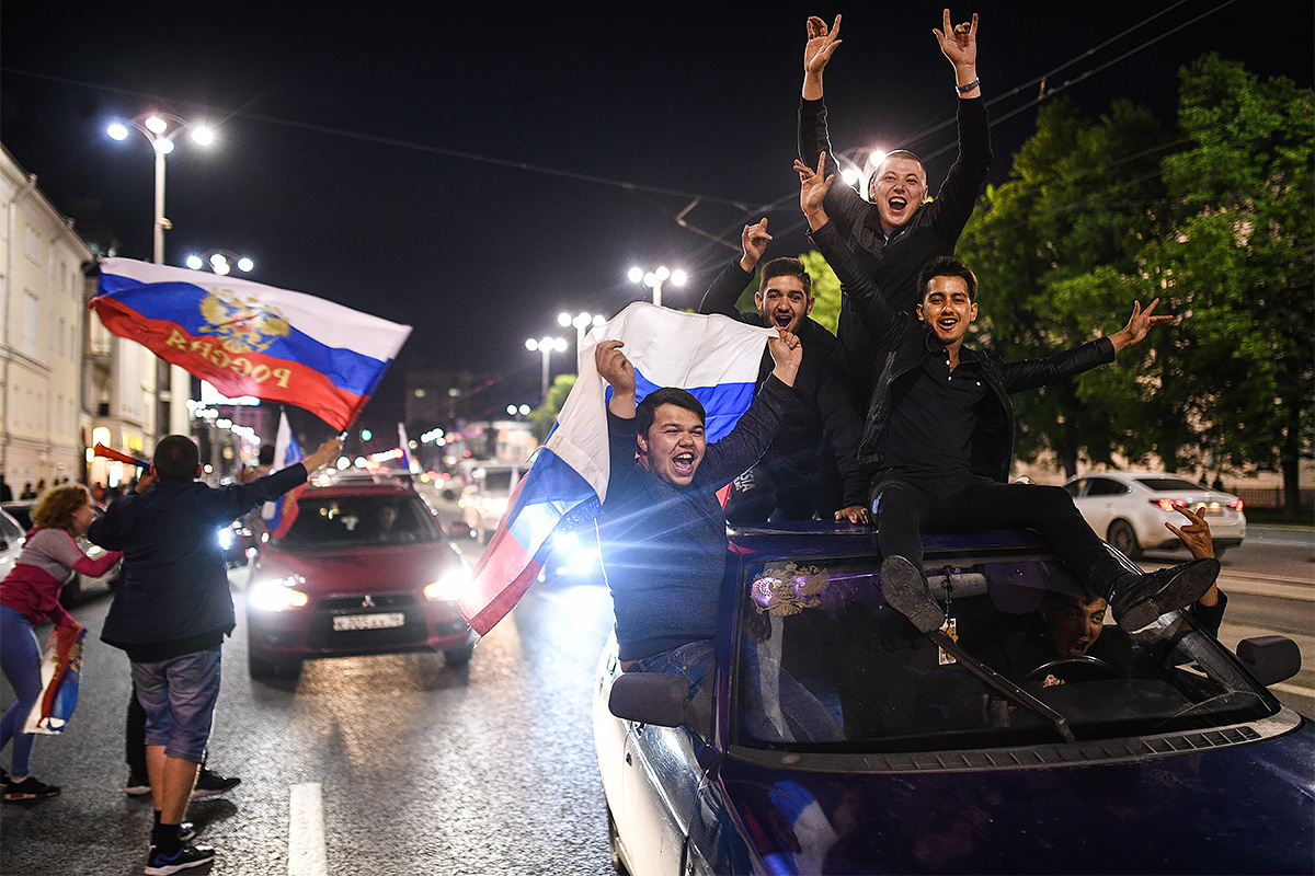 Средний возраст российской сборной по футболу, заявленной на чемпионат — 28,1 год. Большая часть игроков команды родилась позже, чем СССР выходила из группы. На фото: российские болельщики празднуют победу над Египтом в Екатеринбурге Фото: Владимир Астапкович/РИА Новости