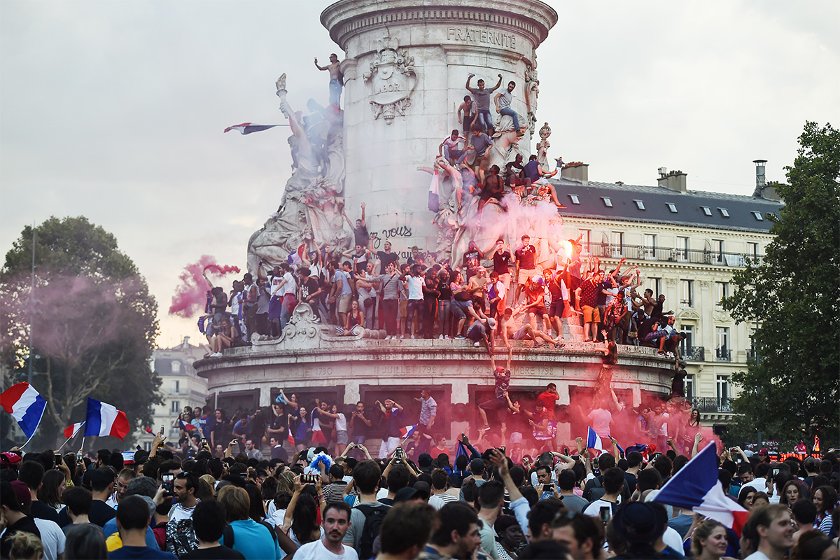 После турнира сборную Франции критикуют за осторожную игру и сомнительный пенальти в финале. Но болельщиков это не смущает. На фото: Площадь Республики, Париж Фото: Lucas Barioulet/AFP