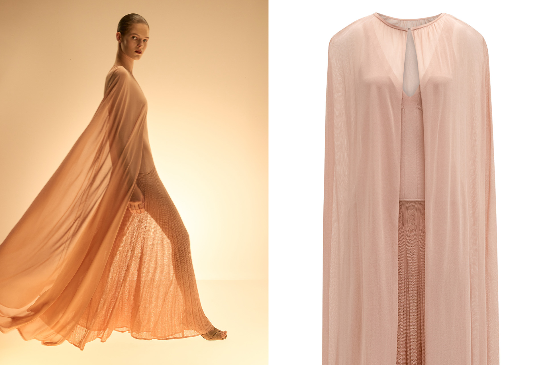 Технология очень кропотливая из-за комбинации разных по плотности, толщине и переплетению кусочков трикотажа: ажурных, плотных двойных, гладких и полупрозрачных. Каждый такой отрезок вывязывается отдельно крошечными петлями. На то, чтобы связать одно платье, уходит около 9,5 часов — в 5 раз больше, чем на базовое вязаное платье. Это настоящее произведение искусства нашей новогодней коллекции — нежные оттенки этого платья напоминают розу, которая распускается только раз в сезон. Многие боятся прозрачности, но мы заранее об этом подумали — внутри платья есть непросвечивающая, тончайшая мини-юбка, а внутри чашечек корсетного лифа — тонкий, приятный к телу трикотаж.