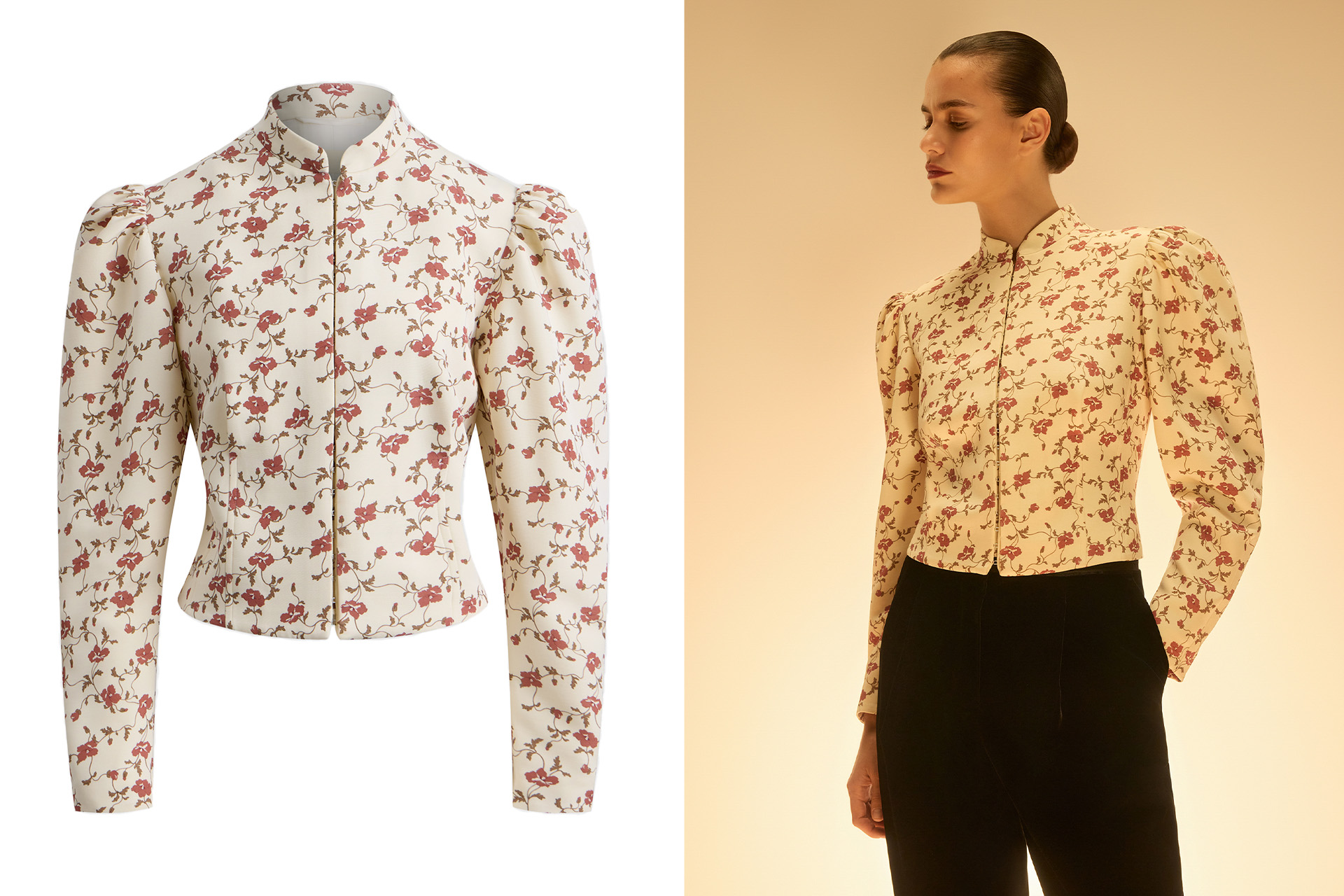 Сам жакет из шерсти и шелка. Мы уже использовали ранее эту ткань, но сейчас впервые перенесли на неё принт ручным методом. Наши дизайнеры оцифровали рисунок, скорректировали оттенки и размеры.