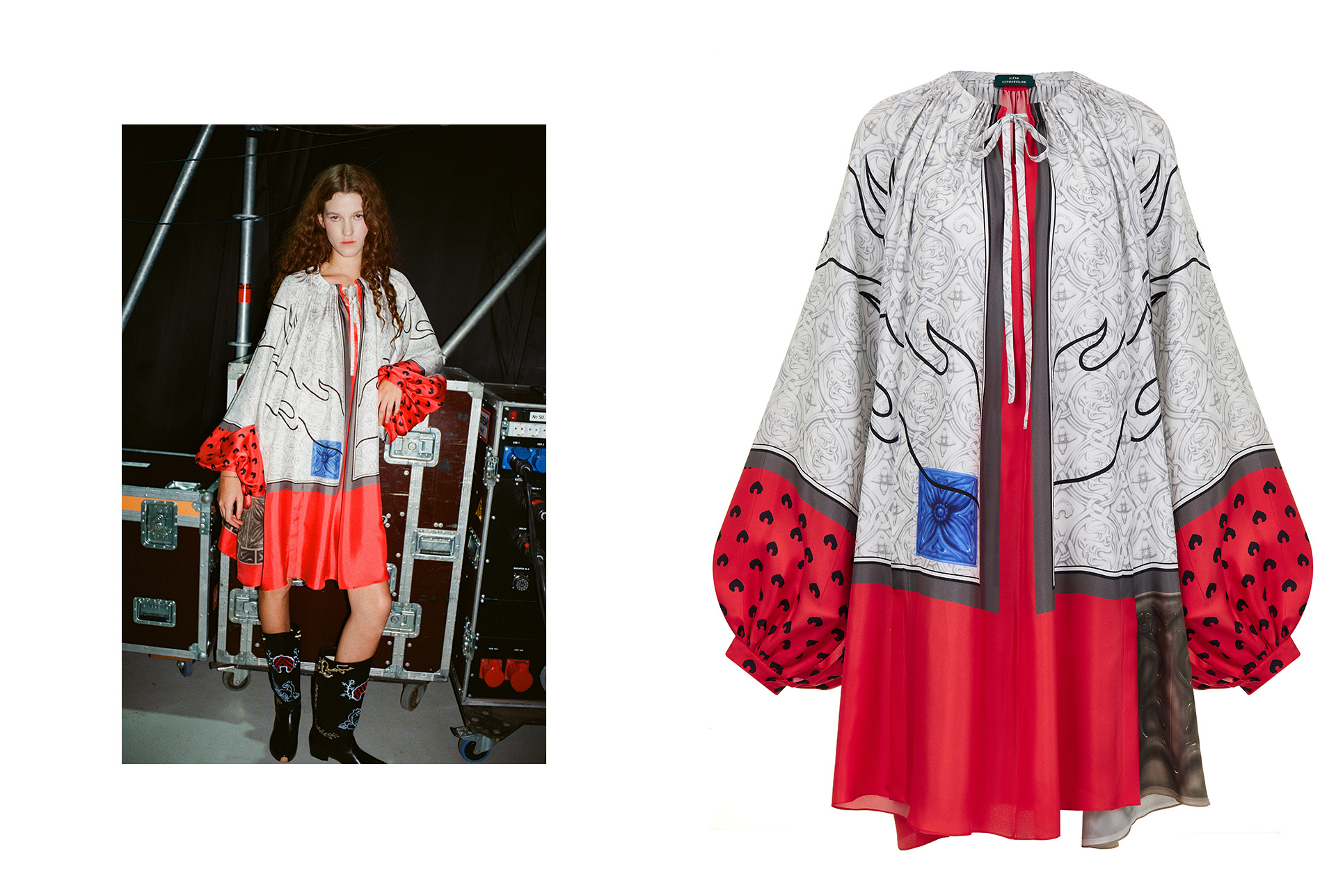 Идея этого платья появилась у меня после погружения в культуру и эстетику народных промыслов древнего Суздаля и подробного знакомства с ними. Принт платья повторяет старинную технику лоскутного шитья. Фасон напоминает традиционную русскую рубаху. Мне самой здесь очень нравятся длинные «боярские» рукава с прорезями для рук.