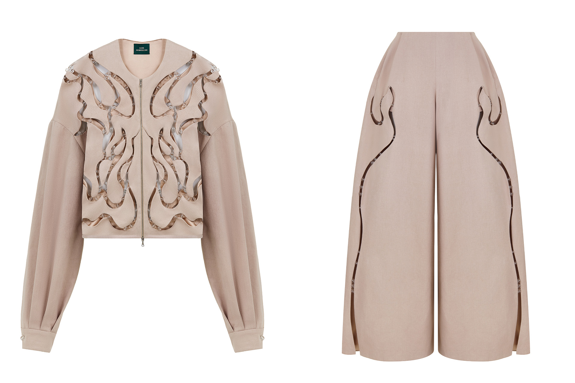 Мне очень нравится джинсовый костюм: бомбер и брюки. По стилю это спортшик. Комплект выполнен в бежевом оттенке и украшен эффектной фигурной «резьбой» со вшитыми в неё прозрачными бусинами. Этот костюм мы решили считать ознаменованием новой, более дерзкой эры бренда Alena Akhmadullina. Для того чтобы почувствовать себя царевной, не обязательно надевать платье.
