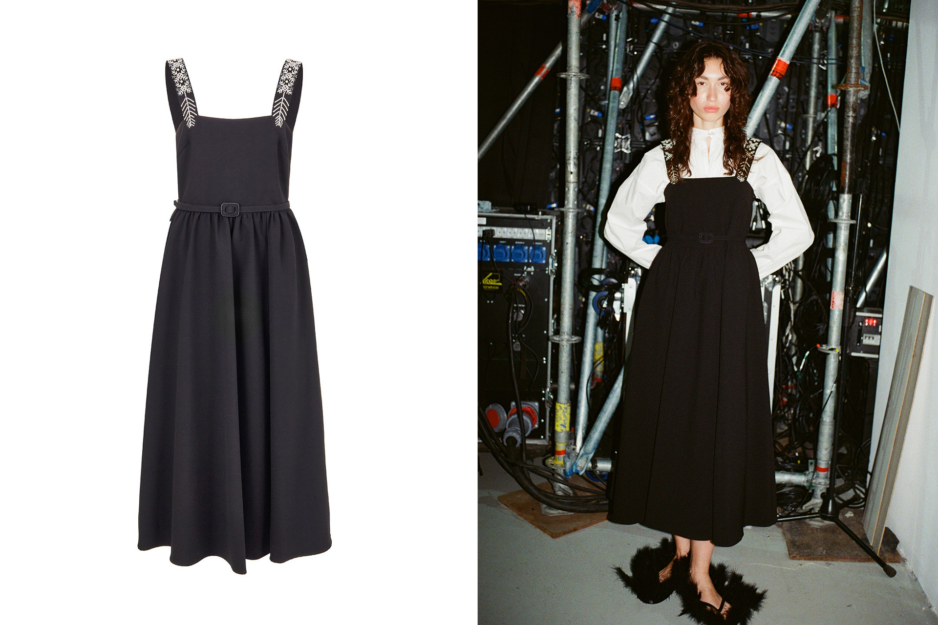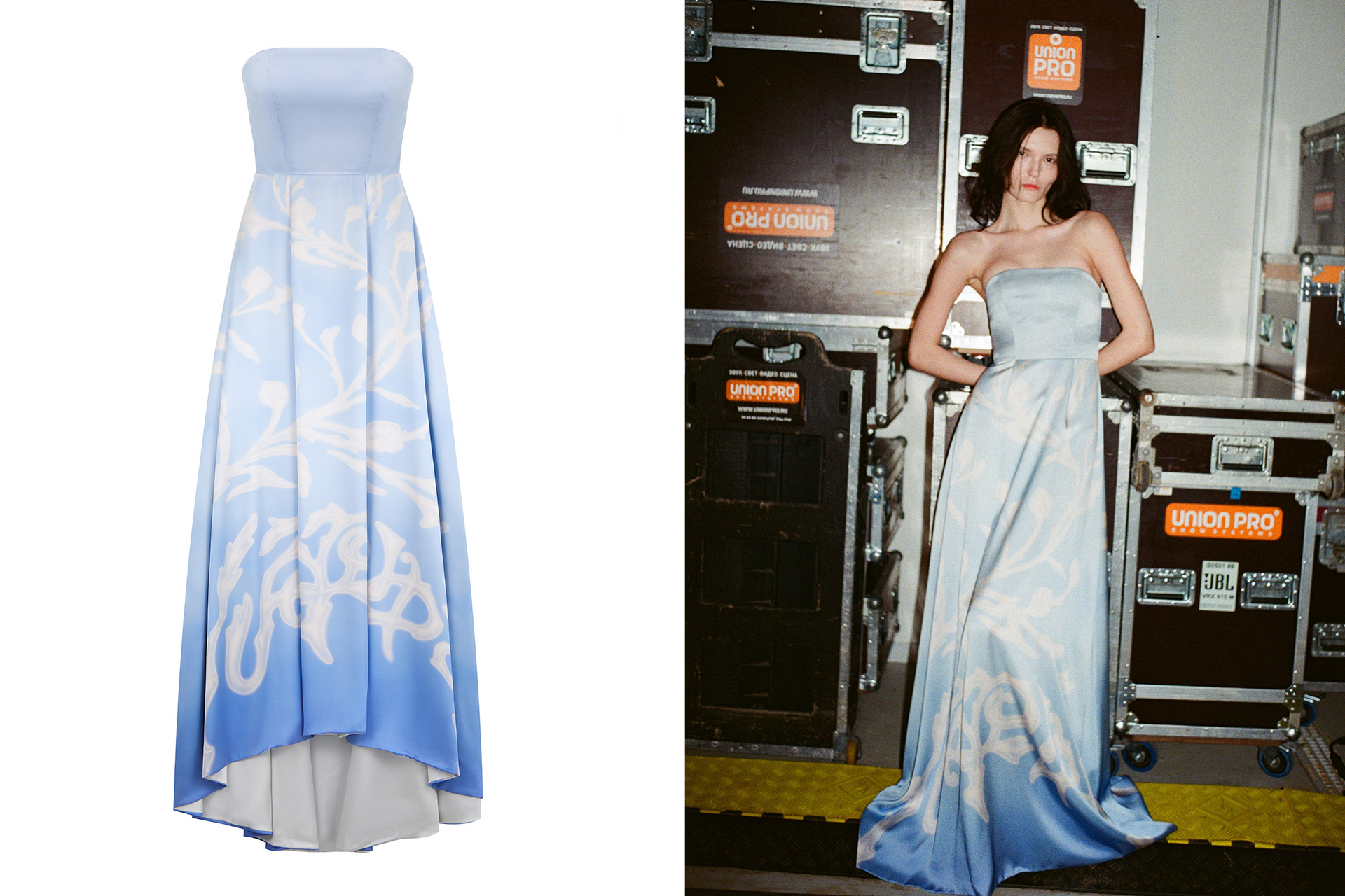 Платье-сарафан со сборкой на талии создано по мотивам предметов народно-художественных промыслов Белгородской области. Оно украшено ручной вышивкой, молочными бусинами и бисером в виде белгородских народных мотивов. Бренд Alena Akhmadullina создавал его несколько лет назад в коллаборации с белгородскими художниками. Спустя годы сарафан снова актуален и представлен в новой коллекции.