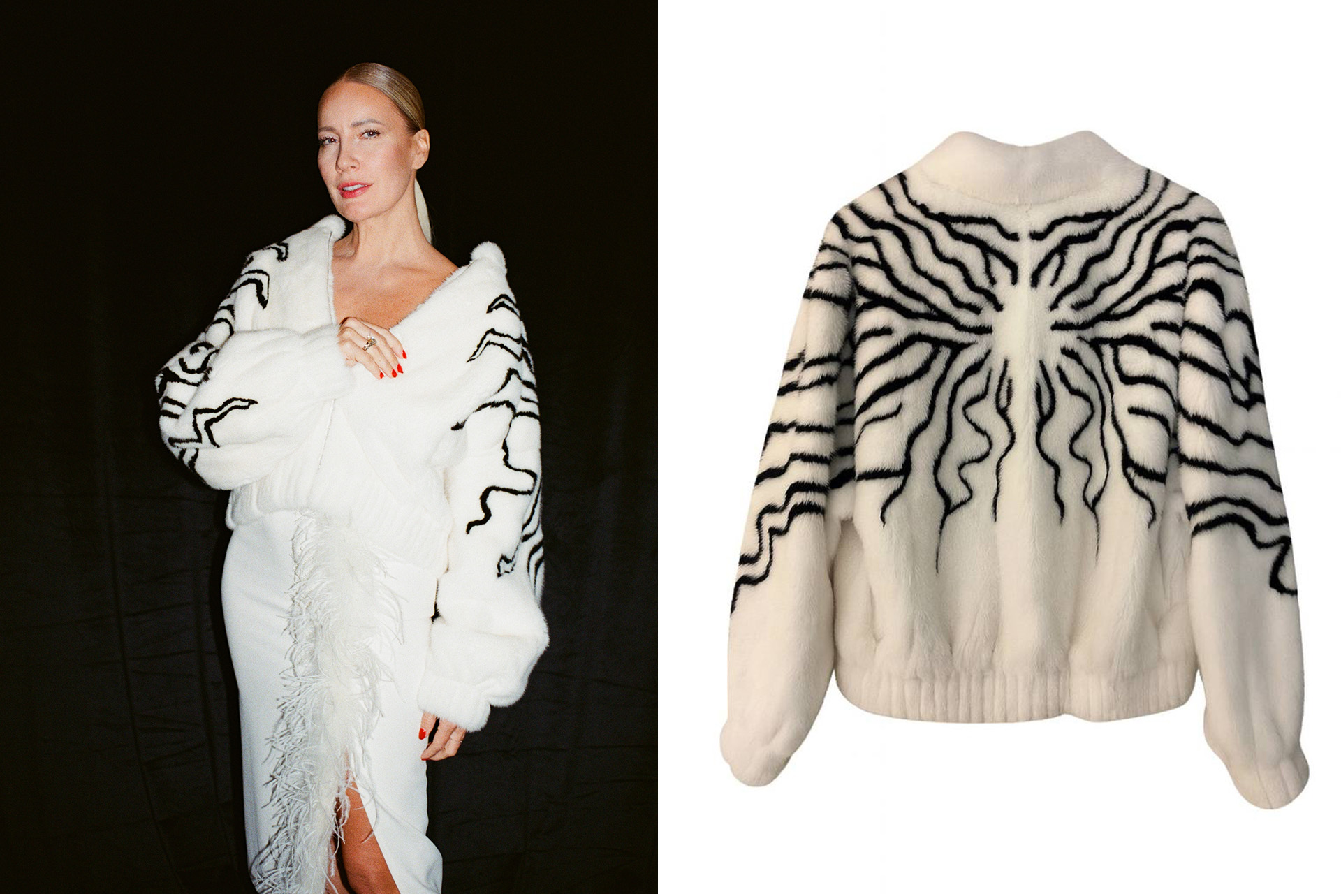И конечно, шуба. Мне очень нравится наш белоснежный норковый бомбер. Мы отошли от привычного, традиционного прочтения мехов в пользу современного дизайна, сложных техник изготовления и оригинальных принтов. У нас бомбер украшен контрастными волнистыми линиями, расходящимися от середины, и получился рисунок солнца с его лучами — древний символ света и защиты от тёмных сил.