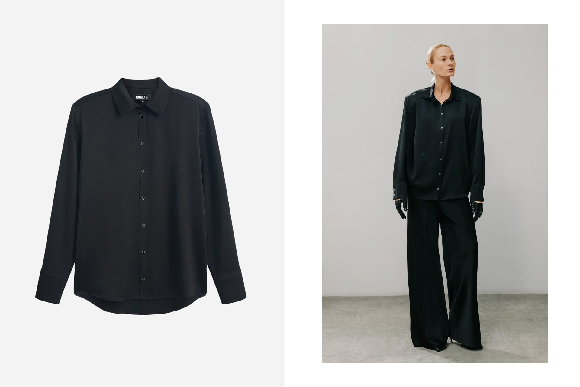 Это комплект — рубашка и брюки из сатина с лёгким благородным блеском. Вместе они образуют тот самый расслабленный, но роскошный тотал-лук, который идеально работает и на торжественных выходах, и на камерных праздничных вечерах. У рубашки есть встроенные подплечники — они делают силуэт более собранным, но главная фишка этого комплекта — брюки. Я сама высокого роста и знаю, что это — когда все брюки в магазине коротки. Эти брюки я ношу с небольшим каблуком.