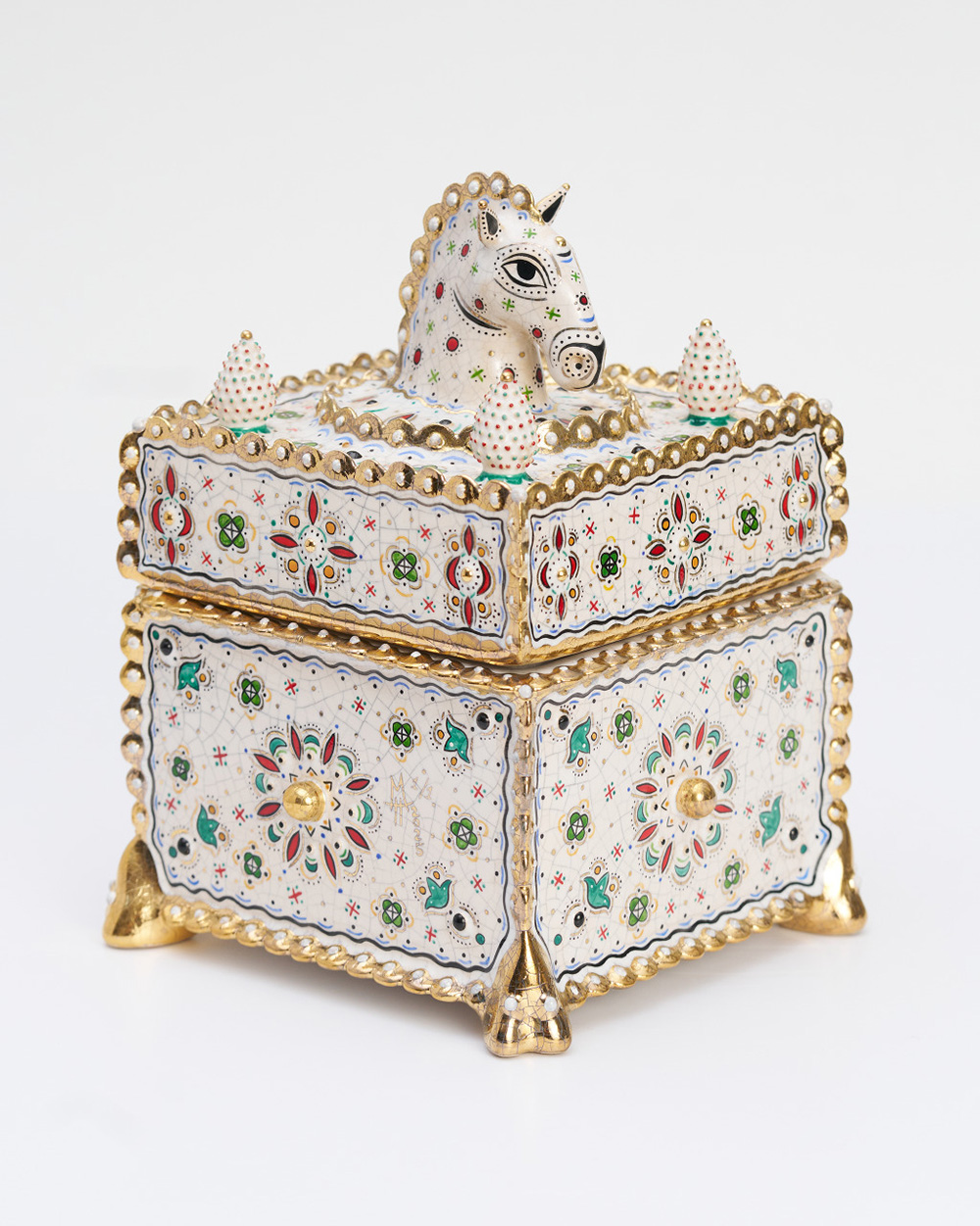 Художник Никита Макаров к наступающему 2026 году подготовил серию, посвященную Огненной Лошади. Вдохновением послужил образ охлупня — резного коня на коньке крыши, который в славянской традиции считался оберегом. В коллекцию вошли четыре предмета: ларец, ритон и две шкатулки. Белая глазурь, тонкое кракле и золотые акценты превращают утилитарные вещи в сакральные арт-объекты, символизирующие энергию солнца.