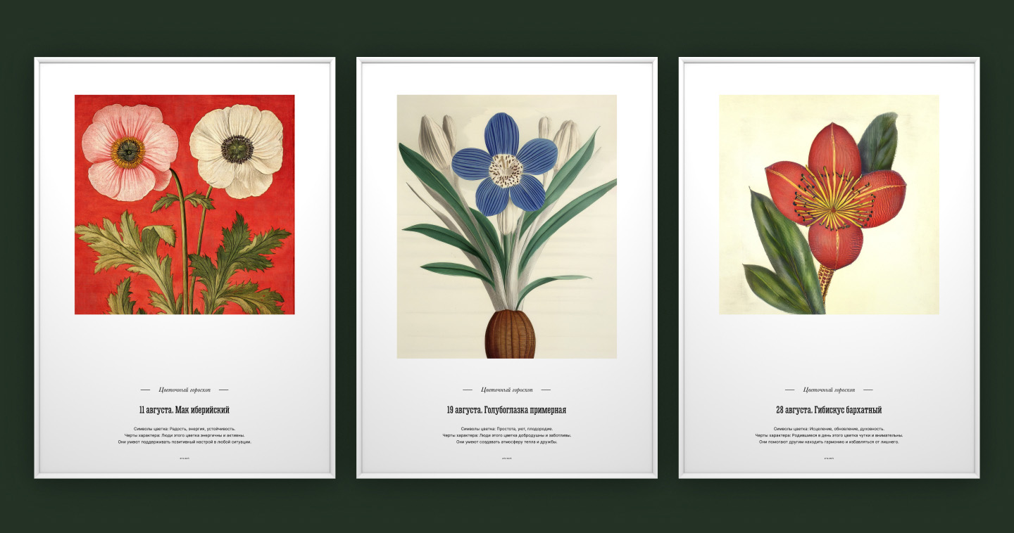 Арт-группа Agey Tomesh создала фантазийный диджитал-проект, где каждому из 365 дней в году соответствует свой уникальный цветок. Это современная интерпретация языка растений и астрологии. На сайте проекта можно найти не только предсказания, но и приобрести вещи с уникальными принтами. Такой подарок подойдет тем, кто ценит тонкие смыслы и эстетику цифрового искусства.