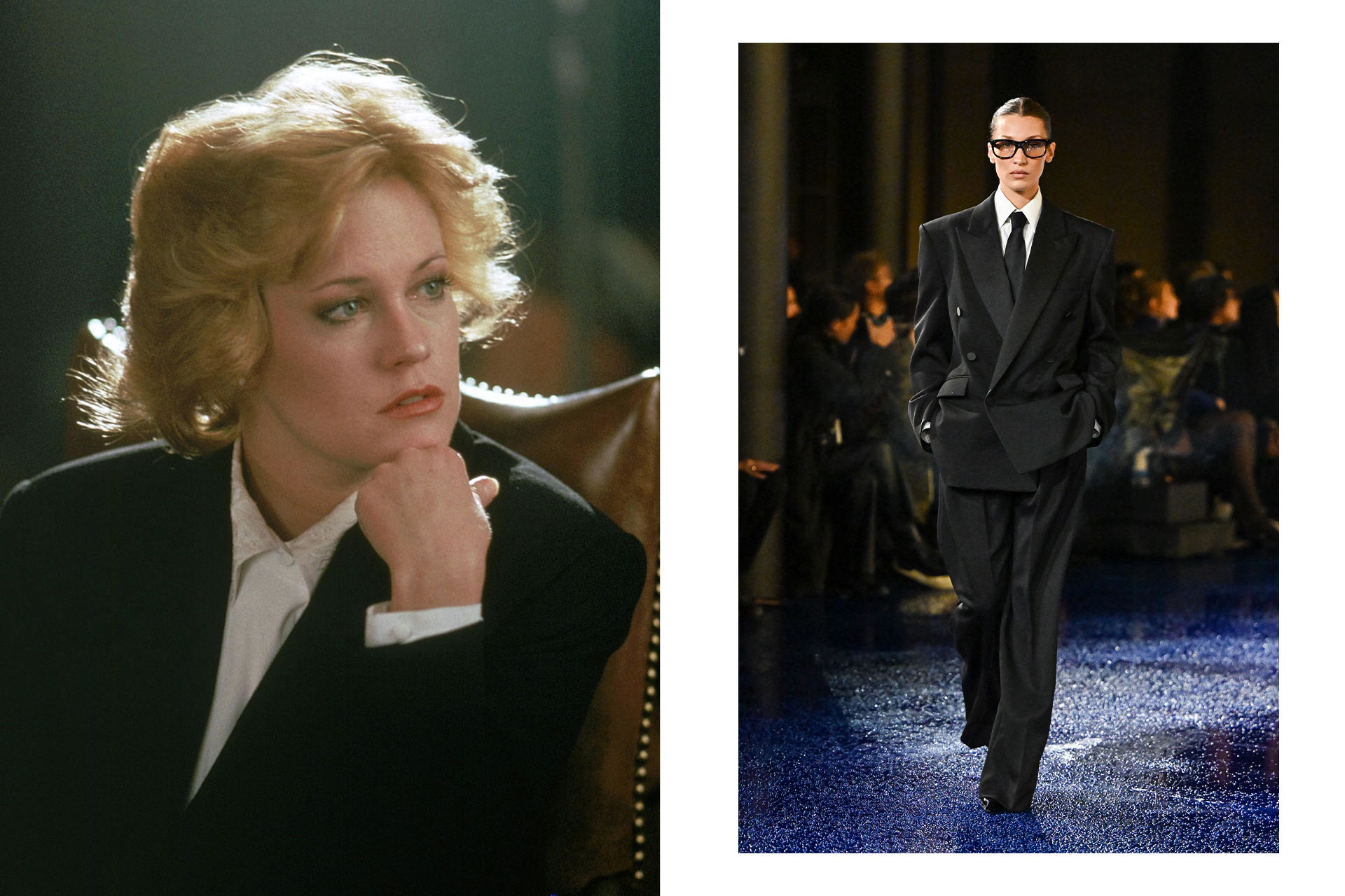 Энтони Ваккарелло, ставший креативным директором Дома в 2016 году, дрейфует от эстетики 1970-х к следующему десятилетию и обратно. Такая траектория — дань истории: оба периода являются знаковыми для Ива Сен-Лорана. При этом почти в каждой коллекции Ваккарелло присутствует иконический силуэт — перевёрнутый треугольник, сформированный расширенной линией плеч, обозначенной талией и узким низом. В пресс-релизах часто упоминается любовь самого Ива к моде 1940-х, и восьмидесятые действительно на них похожи: в обоих случаях женщины одевались подобно мужчинам. Правда, причины были разные: очевидные в военное время и «бизнесовые» — в 1980-х. The Menswear Phenomenon — феномену мужской моды в женском гардеробе — было посвящено подробное эссе в Vogue 1984 года.
