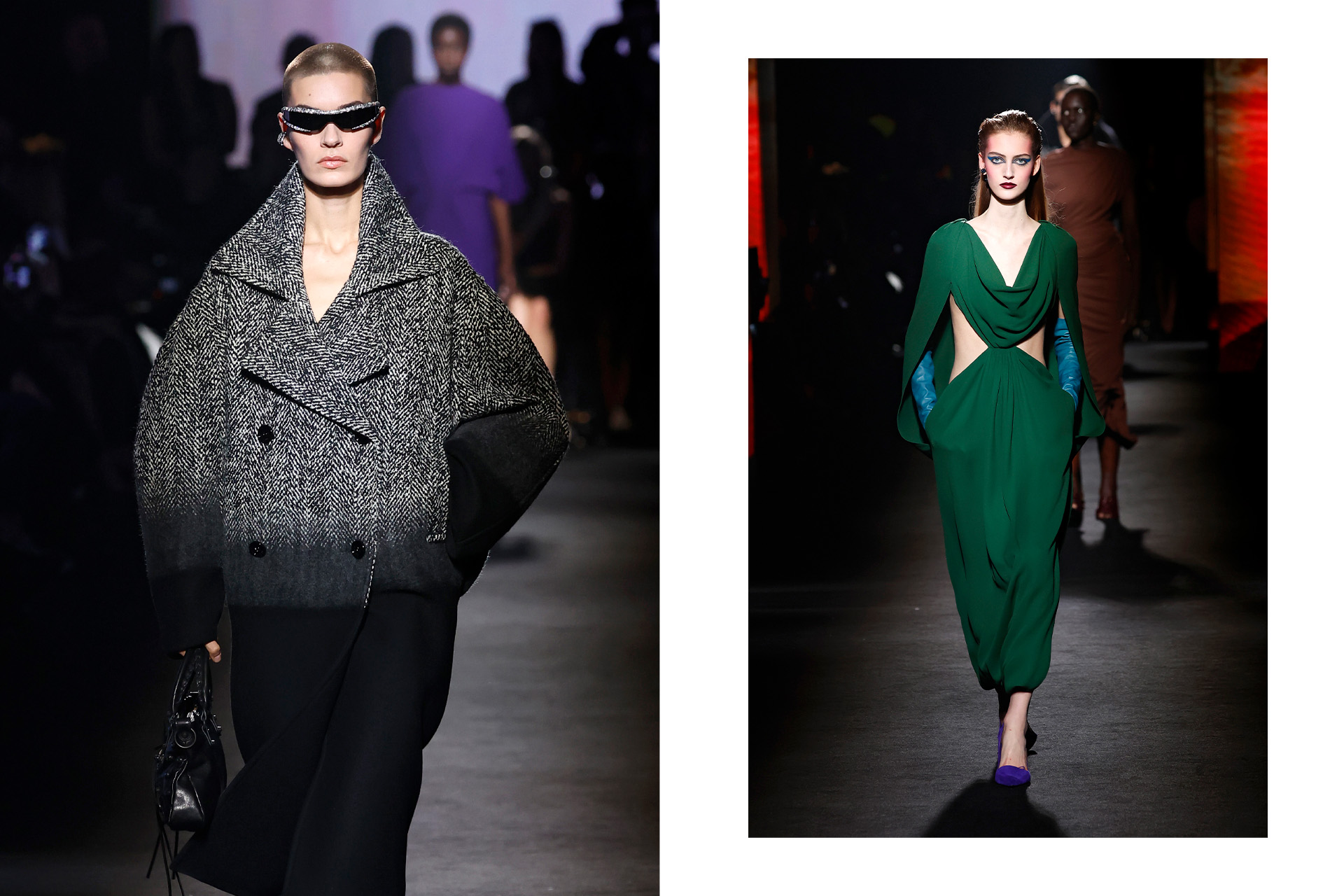 В Balenciaga смену курса продолжил Пьерпаоло Пиччоли, который пришел на место Трона из Valentino. Его вторая коллекция для Дома, созданная в коллаборации с режиссером Сэмом Левинсоном, стала настоящим исследованием светотени. Пиччоли мастерски соединил наследие Кристобаля Баленсиаги — коконоподобные пальто и скульптурные силуэты — с собственным видением современной женственности, добавив драматизма и поэтичности.