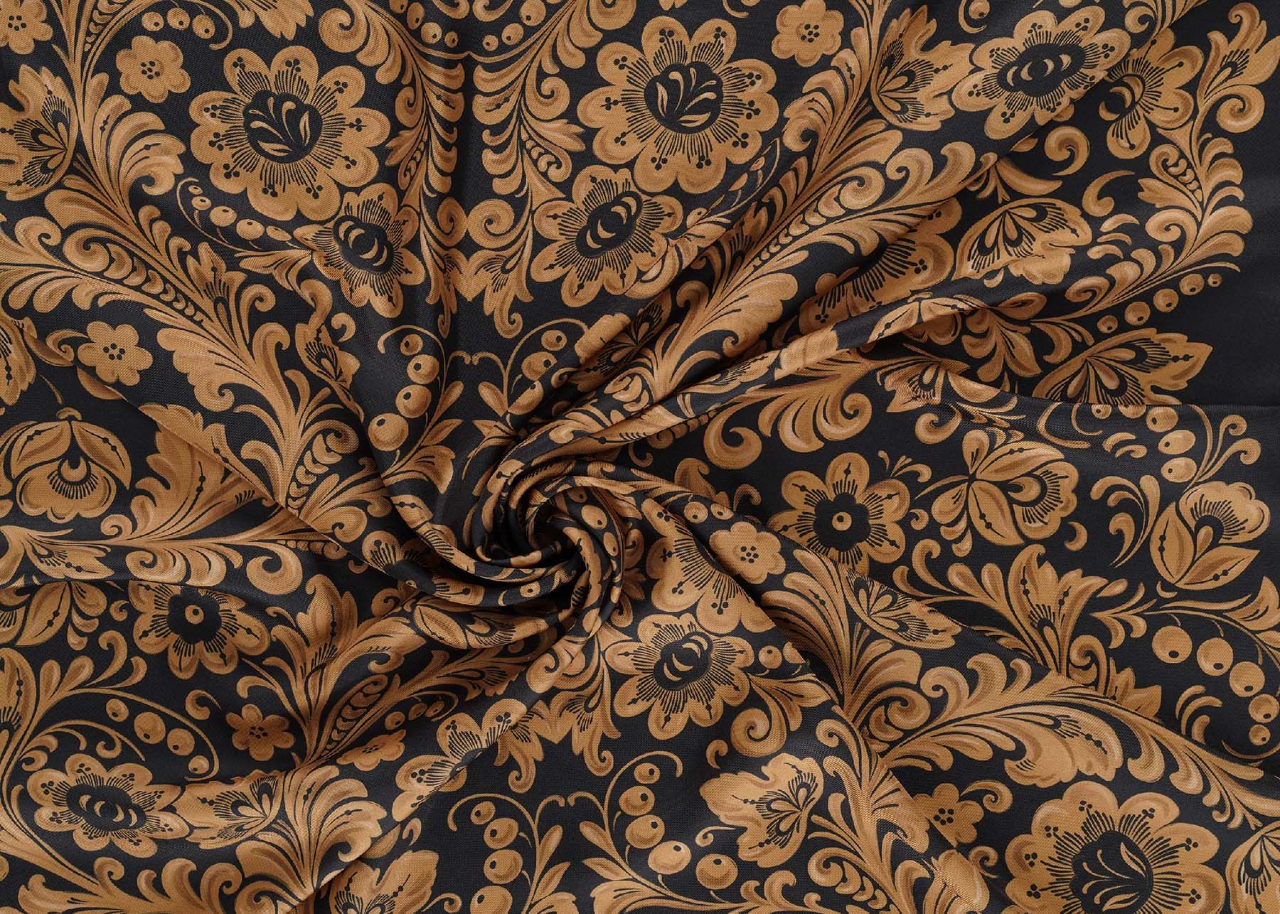Шёлковый платок, вдохновлённый традициями хохломы, работает с классическим сочетанием чёрного и золота. Это не буквальная цитата из народного промысла, а его современная интерпретация в формате аксессуара. Натуральный шёлк придаёт объекту тактильную ценность, а орнамент становится визуальным знаком культурной памяти. Такой платок легко вписывается в повседневный гардероб, оставаясь при этом выразительной деталью. Он существует вне сезонности и трендов, как вещь с устойчивым смыслом.