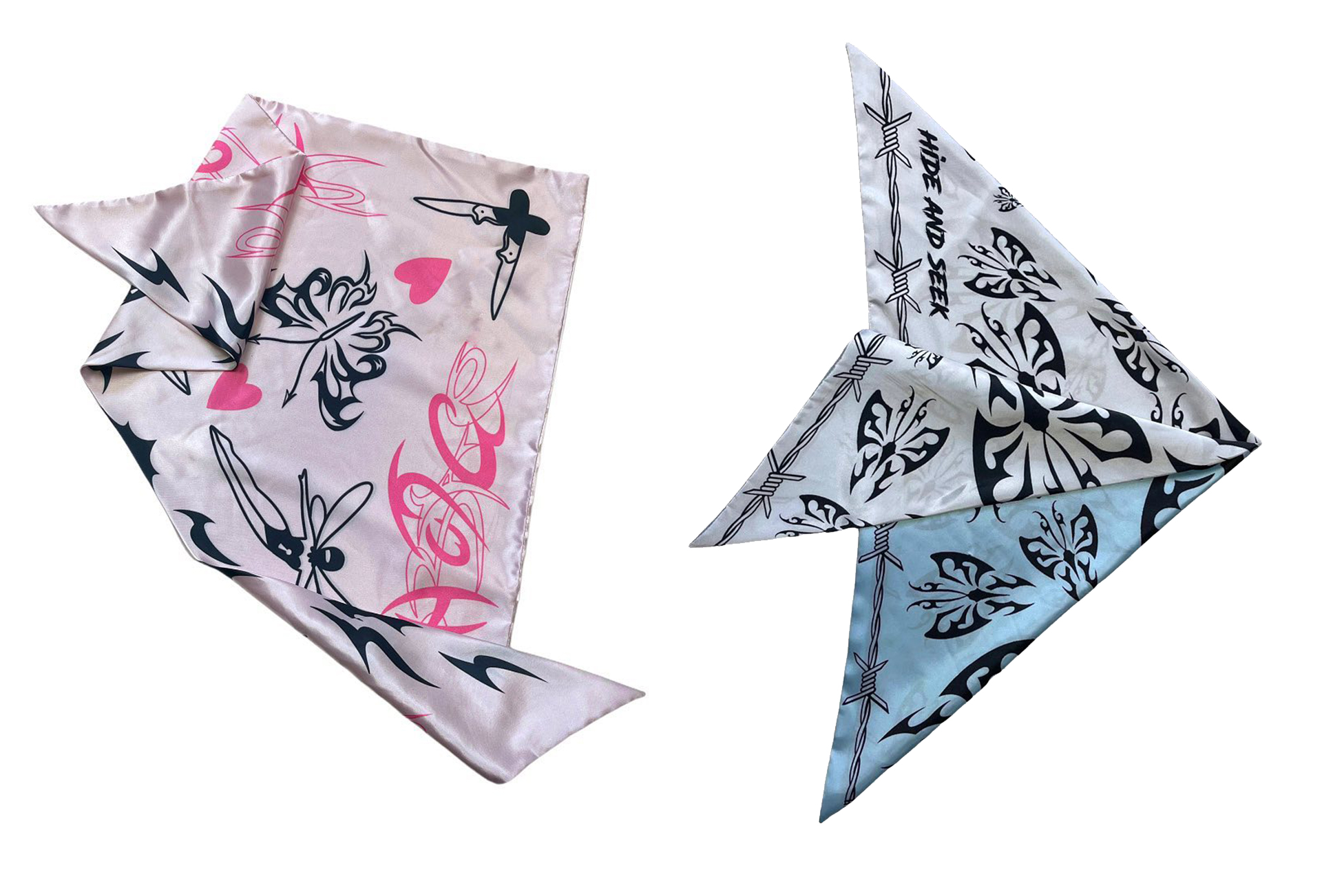 От прямых солнечных лучей спасают не только шляпы, но и платки с косынками. Большой выбор — у московского бренда Hide and Seek. Двусторонние бело-голубые платки с готическим принтом и малиново-черные банданы дополнят спортивный образ, а кремовые косынки в горошек — завершат классический.