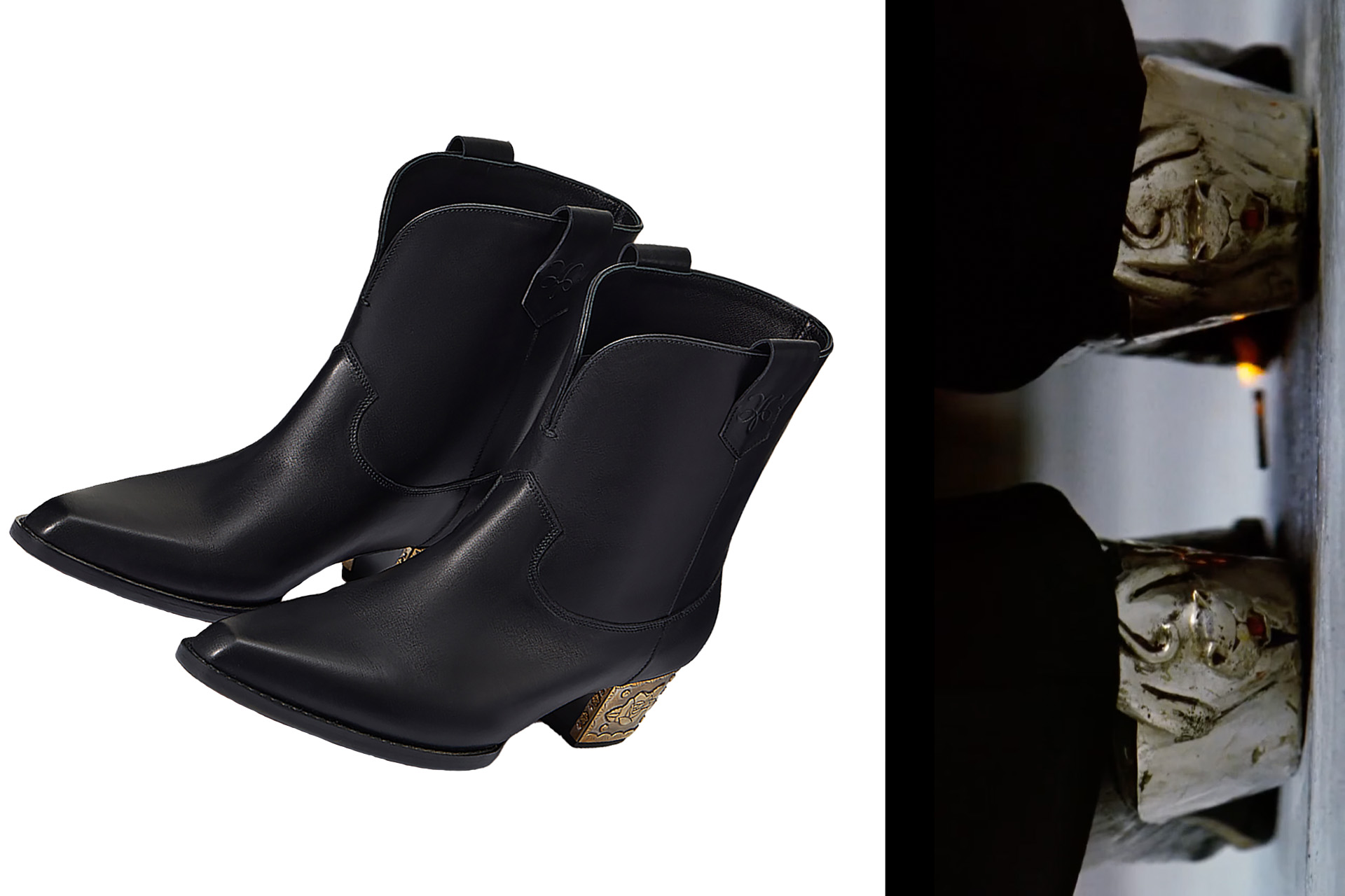 Казаки на металлическом каблуке с фирменным тиснением Ulyana Sergeenko — это отсылка к обуви героя Тайболта Капулета, которого в фильме сыграл Джайлз Мэттьюс. Вся обувь сделана вручную и доступна в ограниченном тираже.