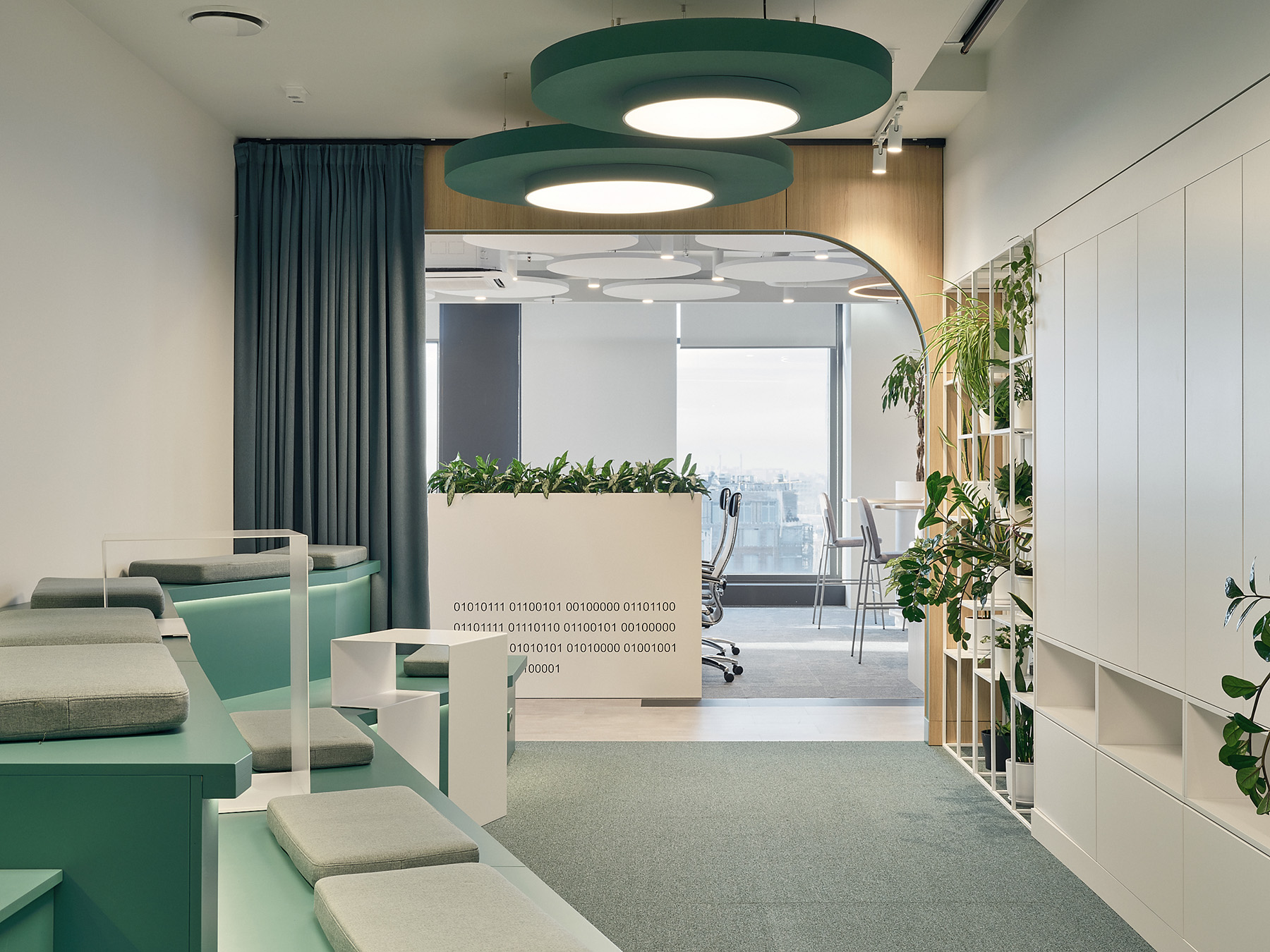 Вместо стен можно использовать, например, раздвижные панели. Тут нам есть что подсмотреть у японцев: внутри домов у них часто нет ни одной капитальной стены, «делить» пространство помогают ширмы. Для маленьких площадей — это крутой подход: добавили панель в однокомнатную квартиру, и вот уже кухня отделена от кровати. Хорошими помощниками могут стать шторы: мне вообще очень нравится зонирование текстилем. Часто думают, что это исключительно жилое решение, но мы постоянно его применяем и в общественных пространствах: в огромном опенспейсе намного удобнее натянуть растяжку из шумопоглощающей ткани от пола до потолка, чем строить стену.