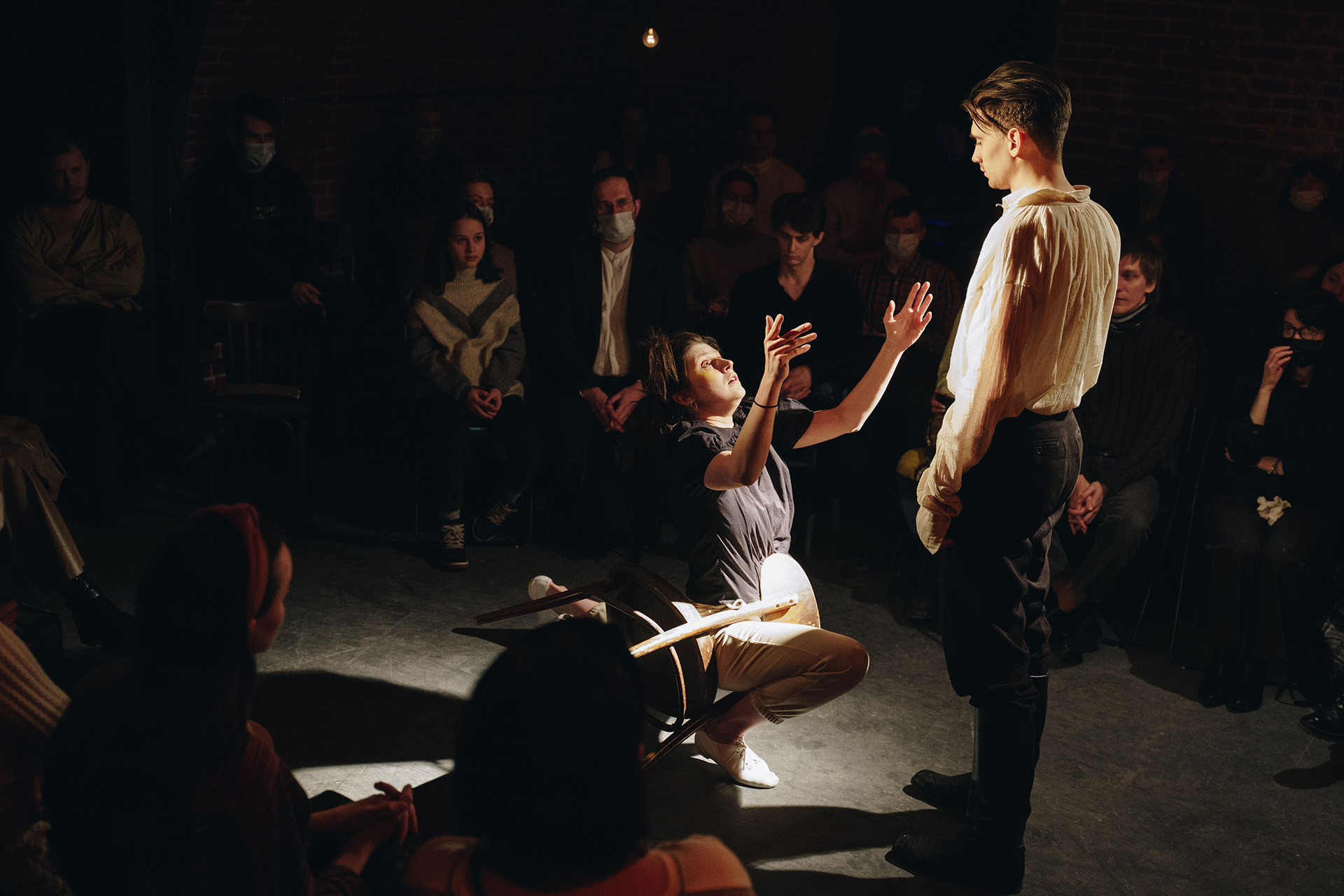 У нас нет задачи поменять текст. Задача — раскрыть его. Мы с коллегами, Ильёй Барабановым и Сергеем Щедриным, пришли к формулировке: сторителлинг как метод разбора роли для актёра. Он рассказывает своими словами то, что прочитал, понял, вытащил для себя, пересказывает авторскую мысль. Достоевский даёт тему, о которой актёр, может, никогда не задумывался, и он начинает думать, погружаться, искать примеры вокруг, другую литературу, случаи из жизни. Присваивает эту тему себе. Сторителлинг в этом смысле — индивидуальный разбор: «Вот я так увидел, вот так прочитал и делюсь тем, что меня тронуло».