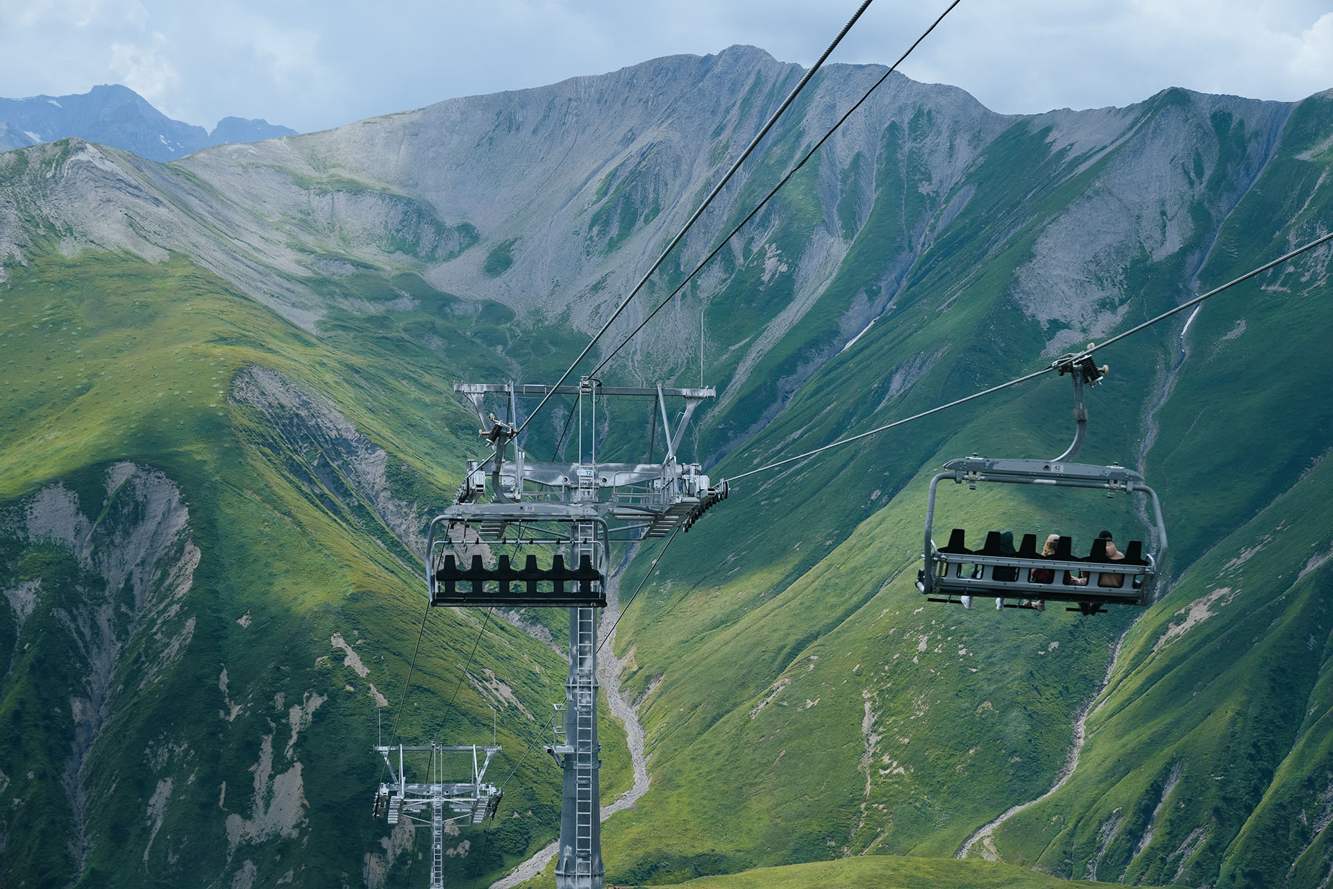 С нижней площадки «Калак», расположенной на высоте около двух тысяч метров, восьмиместные гондолы поднимают гостей почти на километр выше, к отметке 2950 метров. Это верхняя точка курорта, от неё по соседнему склону можно спуститься на шестиместном кресельном подъёмнике к палаточному лагерю, к отметке 2390.