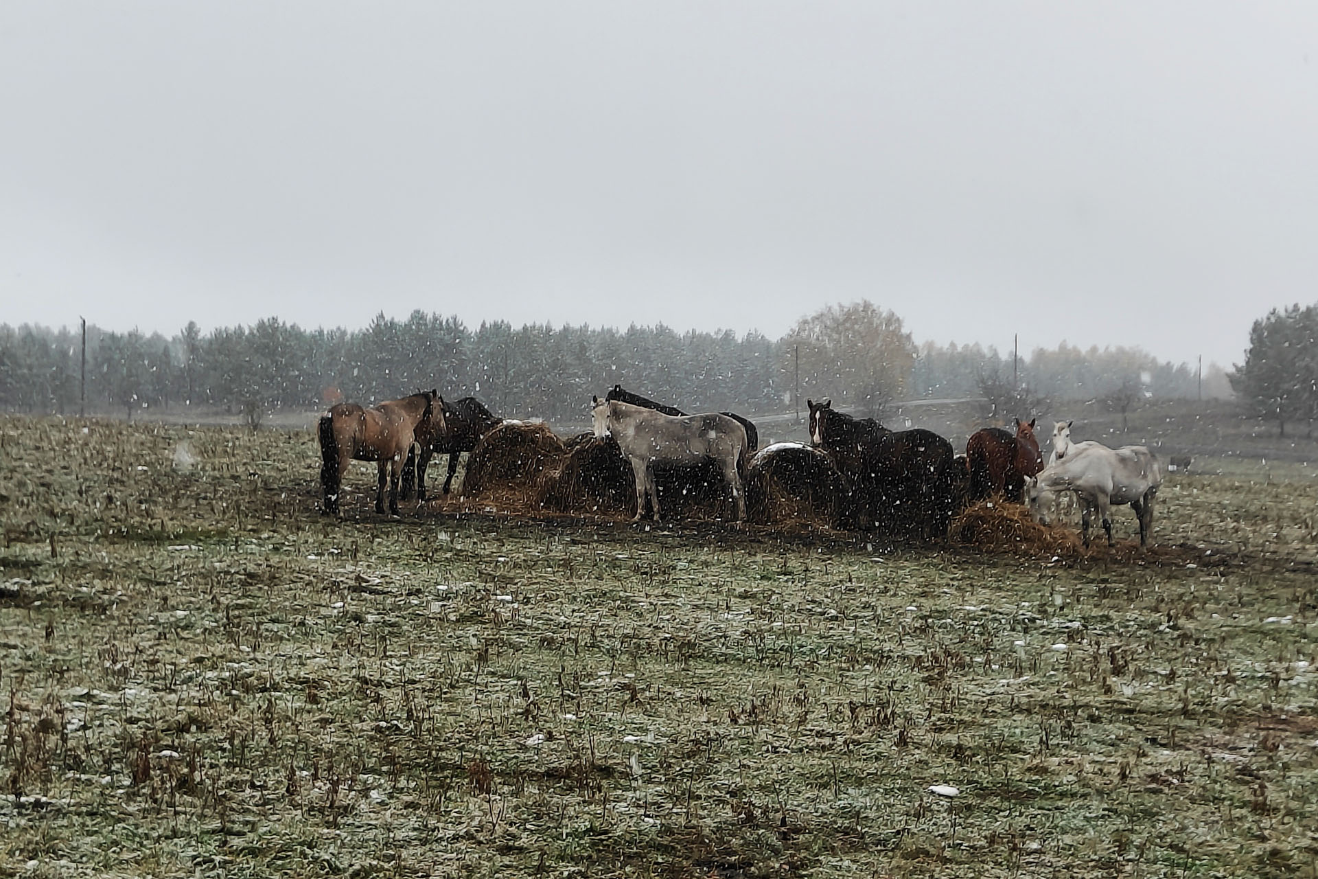 По дороге на смотровую площадку Толгоек встречаем табун лошадей. Их красота затмевает даже открывающиеся с вершины виды. Снег идёт всё сильнее, кажется, что он летит не вниз, а вверх, а мы и правда стоим в центре мира.
