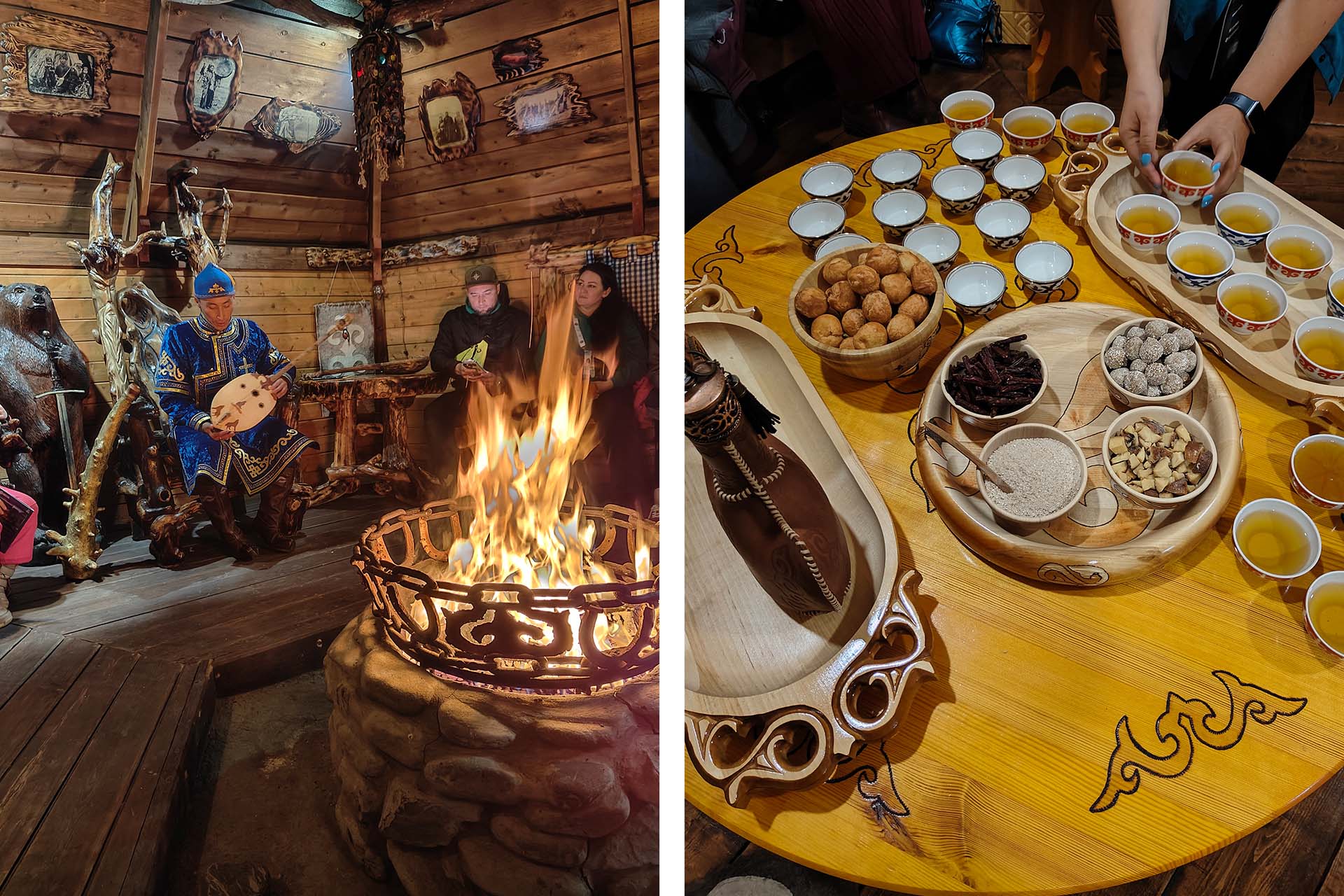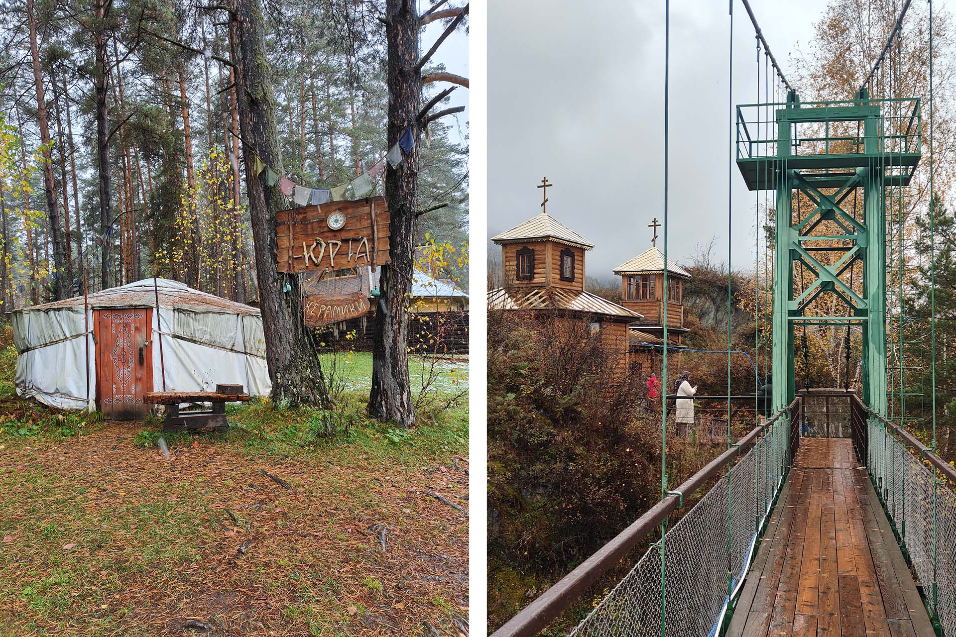 Шестиугольный и конусообразный аил — традиционное жилище алтайцев — в Горно-Алтайске превращён в этномузей. Его основательница Сынару гипнотизирует не только видом, но и голосом: «Я из рода ак-кöбöк, одного из многочисленных среди алтайских родов. Моё имя с алтайского переводится как “Чистая душа”». Она рассказывает про золотое Телецкое озеро, священные деревья и дуальность. Хочется прислониться к стене и слушать, следуя за её голосом, творить собственный миф внутри чужого. Сынару раздаёт по кругу сыр курут, здесь это не твёрдый шарик, который можно часами рассасывать за щекой, а мягкий, копчёный, сладкий и кислый одновременно. Вот бы «Чистая душа» зажгла огонь, разлила чай, укрыла мягкой шкурой и вечно рассказывала свои истории. Но нет, надо ехать, после обеда в ресторане «Рерих» мы выдвигаемся на Чемальский тракт.