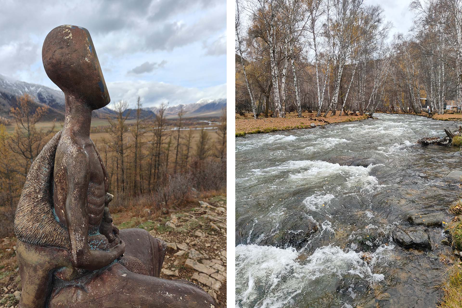 На Семинском перевале нас встречают не только многочисленные торговцы кашемиром и кофе с кедровыми орешками, но и кедры, стоит лишь пройти пару минут в сторону. «В этой роще можно и нужно загадывать желание, они сбываются, проверено», — улыбается наш гид Надежда. Место и правда такое, что уходить отсюда нет никакого желания, несмотря на снег. В голове звучит голос Сынару: «Кедр — дерево Верхнего мира». Спускаемся вниз, и погода начинает стремительно меняться: вместо заснеженного декабря наконец-то попадаем в золотую осень, и первый привет от неё нам передаёт стадо маралов, которое пасётся вдоль дороги. Останавливаем всю автомобильную колонну, передавая по рации, что маралы слева, слева. Водитель даёт мне бинокль, и я рассматриваю зеркало вокруг хвоста и ветвистые, будто бы бархатные рога. В долине реки Каракол будто бы и вовсе весна: солнце, мягкое журчание небыстрой реки, широкие проталины. Минуем каменные изваяния «Кезер Таш» и поднимаемся к памятнику Мальчику с сусликом, построенному в память о животных, спасших людей от голода во время Великой Отечественной.